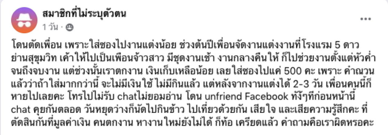 แต่ช่วงนั้นเราตกงาน เงินเก็บเหลือน้อย เลยใส่ซองไปแค่ 500 ค่ะ เพราะคำนวนแล้วว่าถ้าใส่มากกว่านี้ จะไม่มีเงินใช้ ไม่มีกินแล้ว แต่หลังจากงานแต่งได้ 2-3 วัน เพื่อนคนนี้ก็หายไปเลยคะ โทรไปไม่รับ chat ไม่ยอมอ่าน โดน unfriend Facebook ทั้งทีก่อนหน้านี้ chat คุยกันตลอด วันหยุดว่างก็นัดไปกินข้าว ไปเที่ยวด้วยกัน เสียใจ และเสียความรู้สึกค่ะ ที่ตัดสินกันที่มูลค่าเงิน คนตกงาน หางานใหม่ยังไม่ได้ ก็ท้อ เครียดแล้ว คำถามคือเราผิดหรอคะ