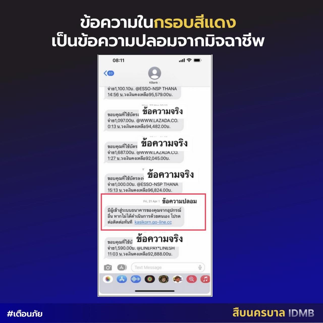 วันที่ 10 พฤษภาคม 2566 แฟนเพจ สืบนครบาล IDMB โพสต์ข้อความให้ความรู้เตือนภัยประชาชนอย่าหลงเชื่อ SMS ปลอมที่โผล่ใน SMS ที่ใช้ชื่อธนาคาร โดยระบุข้อความว่า กลโกงใหม่ ระบาดหนัก! ปลอม SMS ไม่ผ่านเครือข่ายมือถือ เหยื่อโดนแล้วกว่า 50 ราย