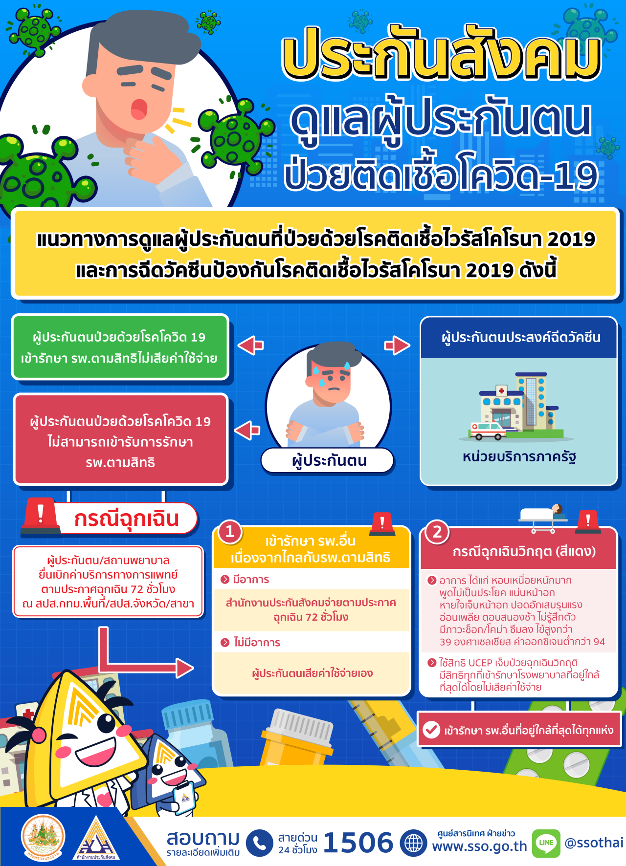 1. ผู้ประกันตนป่วยด้วยโรคติดเชื้อโควิด-19 สามารถเข้ารับการรักษา ณ สถานพยาบาลตามสิทธิของผู้ประกันตน โดยไม่เสียค่าใช้จ่าย