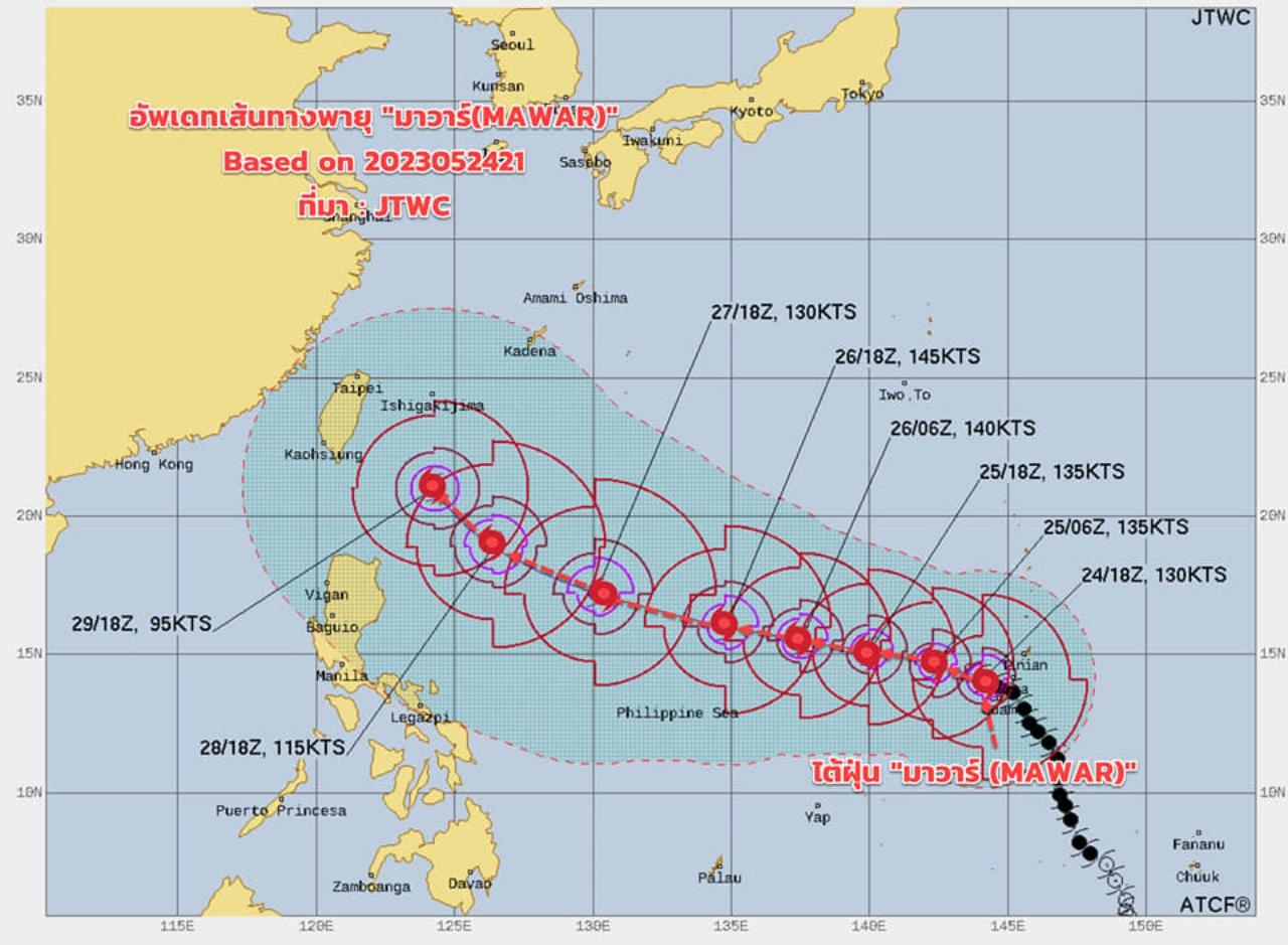 ล่าสุด JTWC และ JMA คาดการณ์ว่า พายุไต้ฝุ่น MAWAR มีแนวโน้มพัฒนาตัวเป็นซุปเปอร์ไต้ฝุ่น ประมาณวันศุกร์ที่ 26 พ.ค.นี้ เนื่องจากอุณหภูมิน้ำทะเลบริเวณดังกล่าวสูงถึง 29-30 องศาเซลเซียส ทำให้มีการสะสมพลังงานความร้อนไปเพิ่มให้กับพายุ