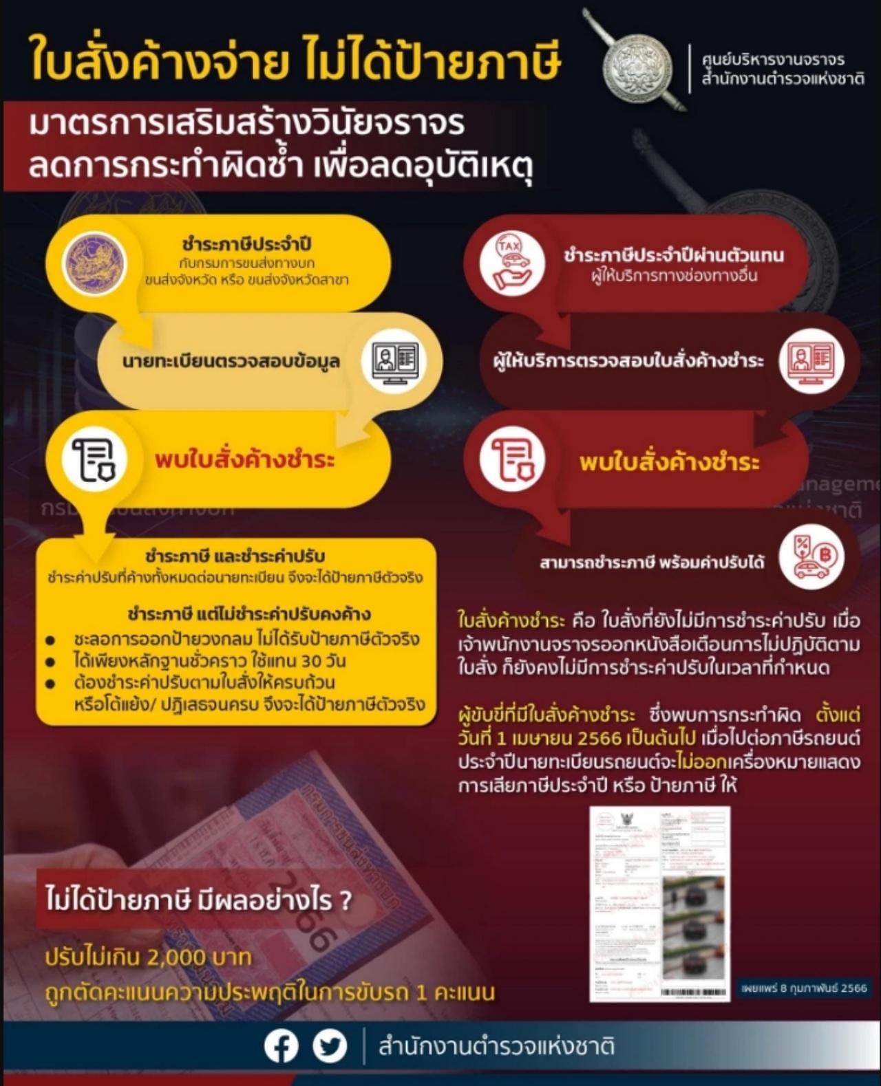 - ผู้ขับขี่ที่มีใบสั่งค้างชำระ ซึ่งพบการกระทำผิดตั้งแต่วันที่ 1 เมษายน 2566 เป็นต้นไป เมื่อไปต่อภาษีรถยนต์ประจำปี นายทะเบียนรถยนต์จะไม่ออกเครื่องหมายแสดงการเสียภาษีประจำปี หรือป้ายภาษีให้