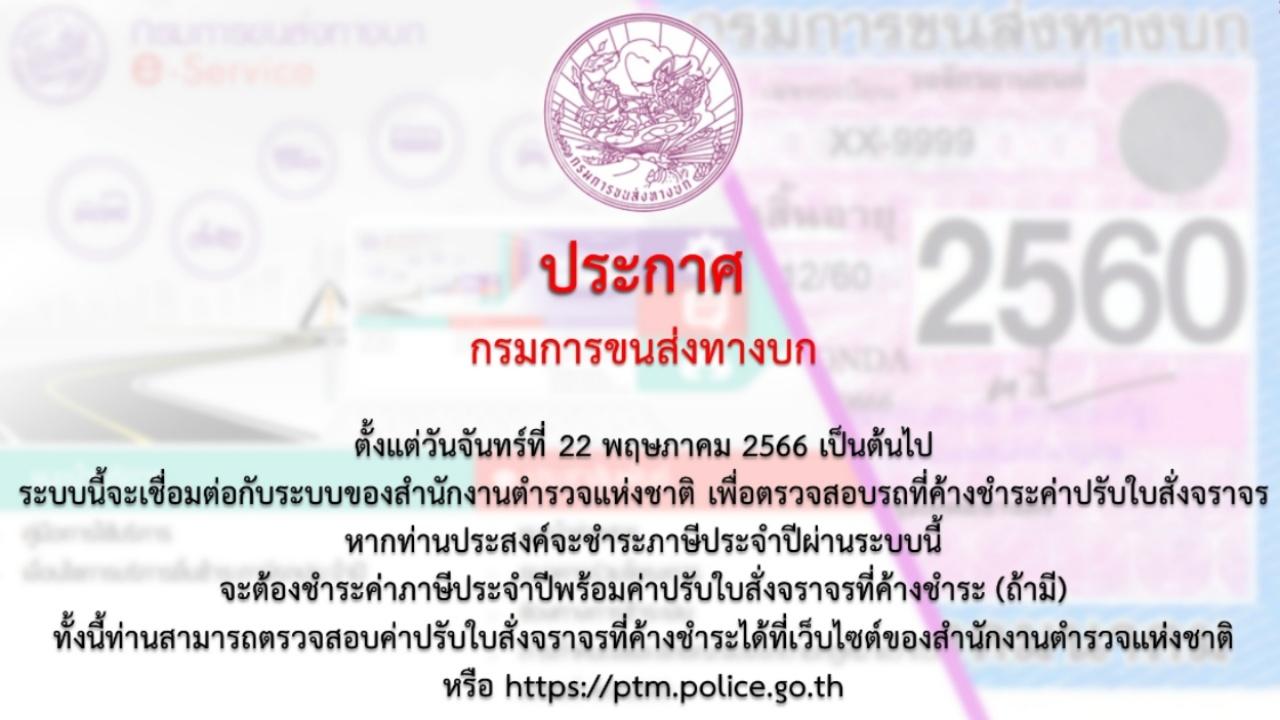 วันที่ 27 พฤษภาคม 2566 มีรายงานว่า เว็บไซต์กรมการขนส่งทางบก ได้ประกาศแจ้งว่า ตั้งแต่วันจันทร์ที่ 22 พฤษภาคม 2566 เป็นต้นไป ระบบนี้จะเชื่อมต่อกับระบบของสำนักงานตำรวจแห่งชาติ เพื่อตรวจสอบรถที่ค้างชำระค่าปรับใบสั่งจราจร