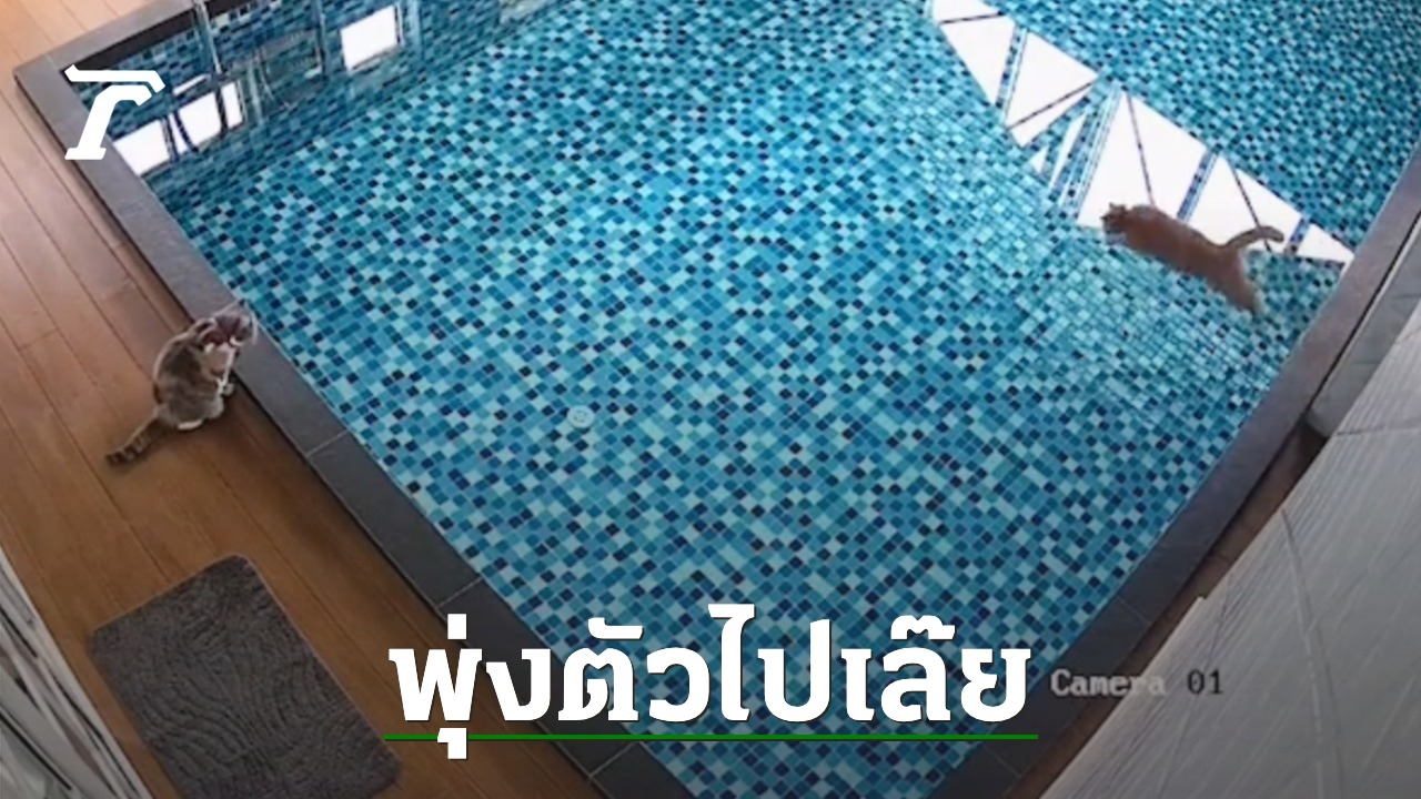 หรือจะกลัวความผิด เมื่อ "แมวส้ม" กระโดดตัวลอยลงสระว่ายน้ำ เจ้าของเห็นเปิดประตูมาดู แต่น้องรีบว่ายขึ้นฝั่ง วิ่งสวนเข้าบ้านอย่างไว