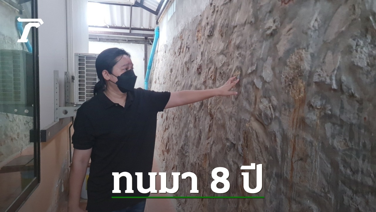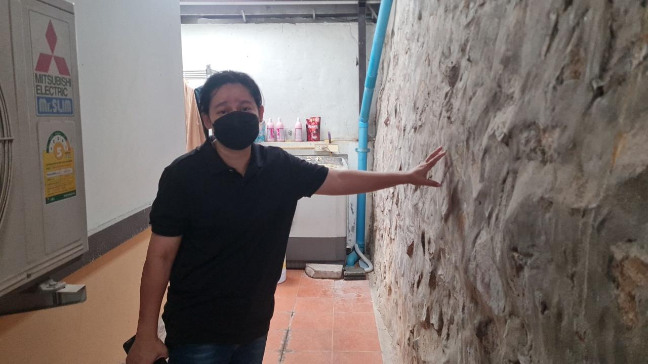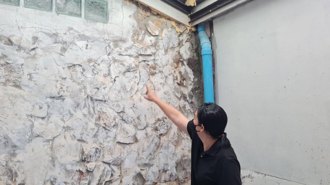 โดยพื้นบ้านหมู่บ้านอีกฝั่งที่ติดกัน พื้นชั้นแรกเท่ากับหลังคาบ้านเราพอดี พอมีฝนตกน้ำก็จะไหลผ่านกำแพงหมู่บ้านเขา ก่อนจะทะลักมายังกำแพงบ้านของเรา เราเจอปัญหาดังกล่าวมาแล้วกว่า 6-7 ปี ทุกวันนี้อยู่ด้วยความหวาดกลัว เกรงว่ากำแพงจะถล่มมาทับตัวบ้าน และคนที่อยู่บ้านตลอดเวลา เพราะตอนนี้กำแพงบ้านเกิดร้าว และมีไหลออกมาตลอดเวลา โดยเฉพาะเวลาช่วงฝนตก จะมีน้ำไหลออกจากแนวร้าวกำแพงจำนวนมาก ตอนนี้อยากให้มีหน่วยงานเข้ามาดูแล และแก้ไขช่วยชาวบ้าน