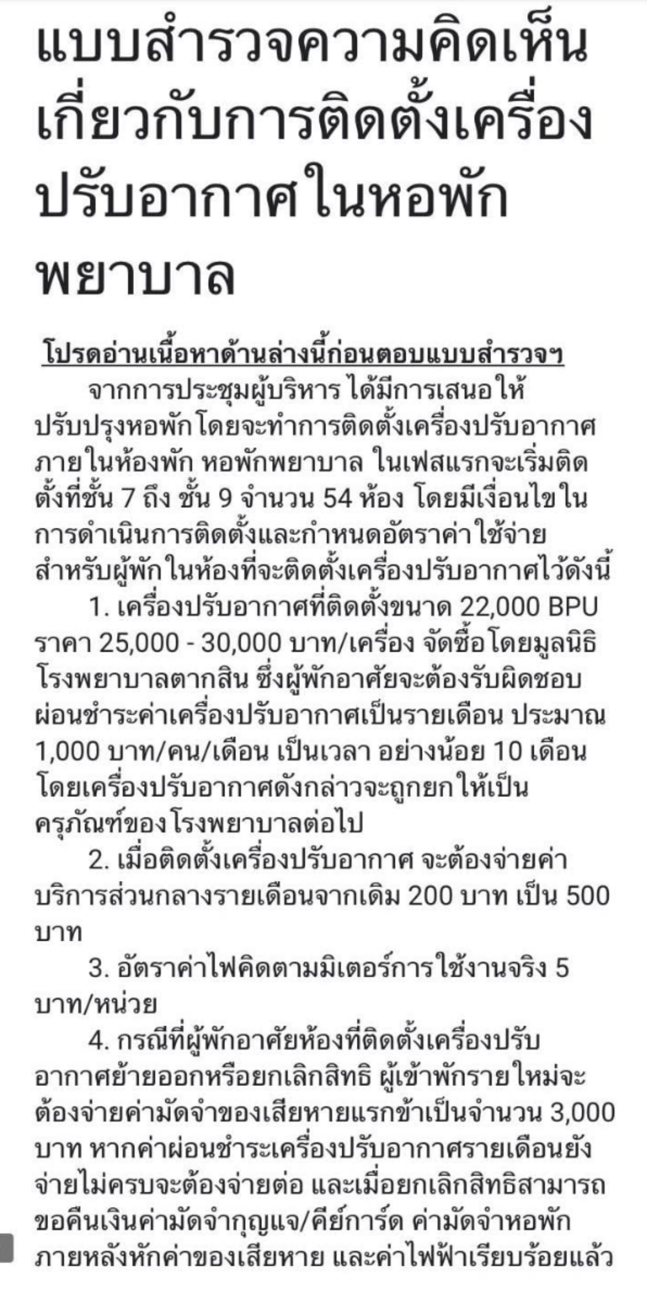 กลายเป็นเรื่องราวที่ถูกพูดถึงอย่างมากในโลกออนไลน์ เมื่อผู้ใช้เฟซบุ๊กรายหนึ่ง ได้โพสต์ภาพโรงพยาบาลดังทำแบบสำรวจสอบถามความคิดเห็น ติดแอร์หอพักให้พยาบาล แต่ต้องผ่อนเองและยกให้เป็นครุภัณฑ์ โดยระบุข้อความว่า จากการประชุมผู้บริหารได้มีการเสนอให้ปรับปรุงหอพัก โดยจะทำการติดตั้งเครื่องปรับอากาศภายในหอพักหอพักพยาบาลในเฟสแรกจะเริ่มติดตั้งที่ชั้น 7 ถึงชั้น 9 จำนวน 54 ห้อง โดยมีเงื่อนไขในการดำเนินการติดตั้งและกำหนดอัตราค่าใช้จ่ายสำหรับผู้พักในห้องที่จะติดตั้งเครื่องปรับอากาศไว้ ดังนี้