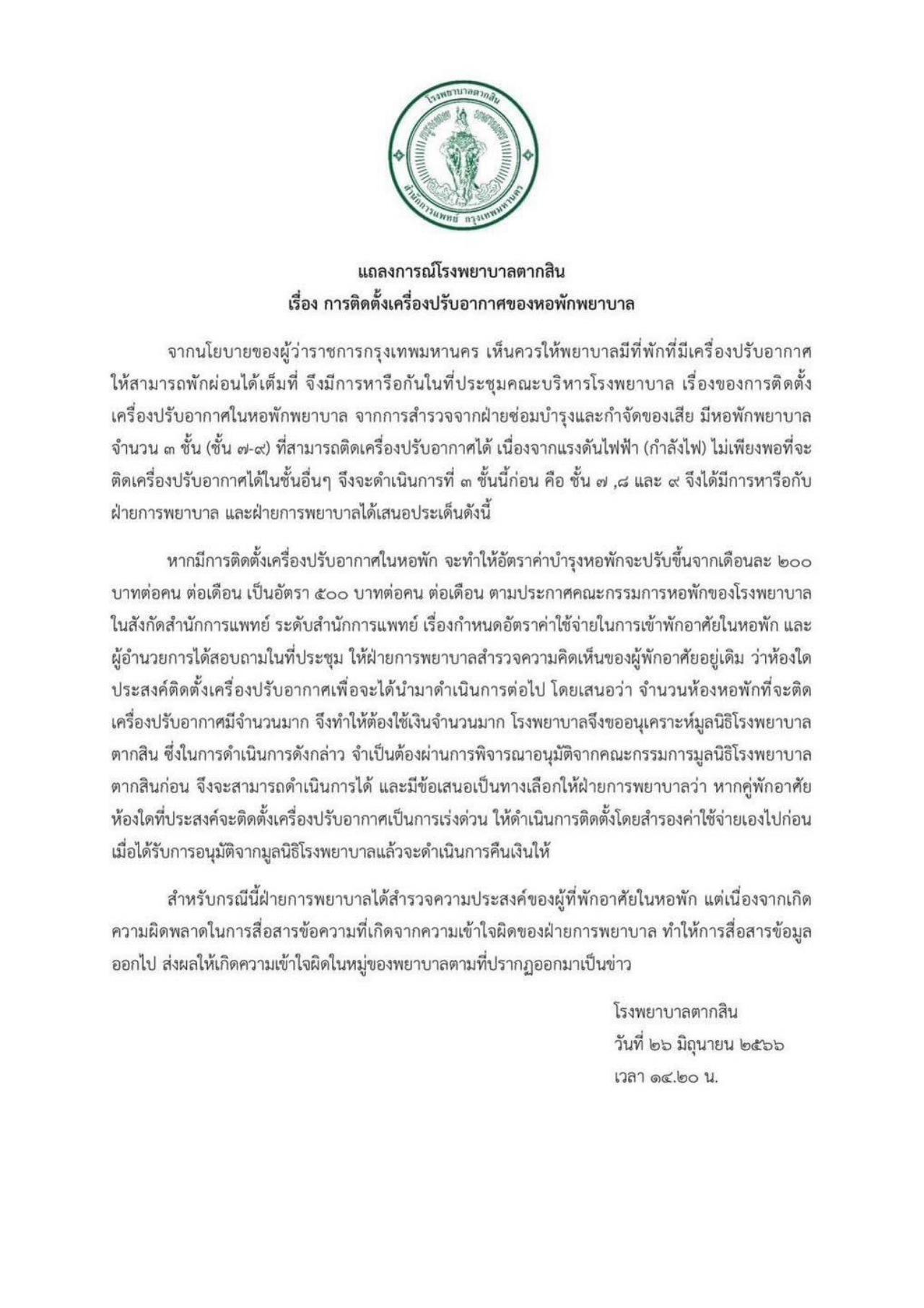 ล่าสุด วันที่ 26 มิ.ย. 2566 โรงพยาบาลตากสิน ได้แถลงการณ์เรื่อง "การติดตั้งเครื่องปรับอากาศของหอพักพยาบาล" โดยระบุว่า จากนโยบายของผู้ว่าราชการกรุงเทพมหานคร เห็นควรให้พยาบาลมีที่พักที่มีเครื่องปรับอากาศ ให้สามารถพักผ่อนได้เต็มที่ จึงมีการหารือกันในที่ประชุมคณะบริหารโรงพยาบาล เรื่องของการติดตั้งเครื่องปรับอากาศในหอพักพยาบาล จากการสำรวจจากฝ่ายซ่อมบำรุงและกำจัดของเสีย มีหอพักพยาบาลจำนวน 3 ชั้น (ชั้น 7-9) ที่สามารถติดเครื่องปรับอากาศได้ เนื่องจากแรงดันไฟฟ้า (กำลังไฟ) ไม่เพียงพอที่จะติดเครื่องปรับอากาศได้ในชั้นอื่นๆ จึงจะดำเนินการที่ 3 ชั้นนี้ก่อน คือ ชั้น 7, 8 และ 9 จึงได้มีการหารือกับฝ่ายการพยาบาล และฝ่ายการพยาบาลได้เสนอประเด็น ดังนี้