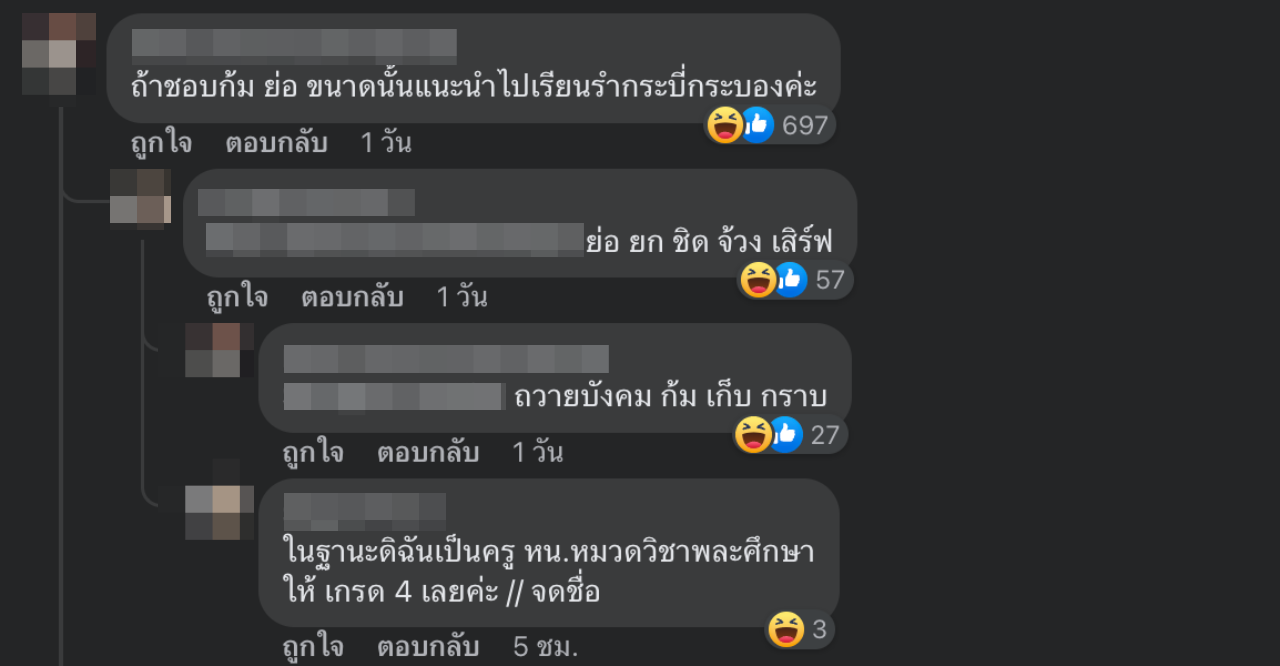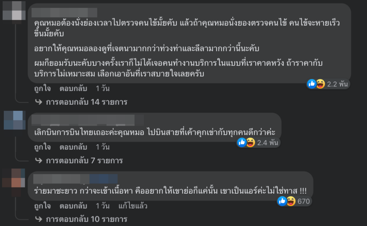 อย่างไรก็ตาม หลังจากที่โพสต์ดังกล่าวถูกแชร์ออกไป ก็มีคนเข้ามาแสดงความคิดเห็นจำนวนมาก ส่วนใหญ่สงสัยว่า การที่ลูกเรือยืนให้บริการนั้นเป็นการไม่ให้เกียรติกับผู้โดยสารอย่างไร อาทิ เลิกบินการบินไทยเถอะค่ะคุณหมอ ไปบินสายที่เขาคุกเข่ากับทุกคนดีกว่าค่ะ, ถ้าชอบก้ม ย่อ ขนาดนั้น แนะนำไปเรียนรำกระบี่กระบองค่ะ, ร่ายมาซะยาว กว่าจะเข้าเนื้อหา คืออยากให้เขาย่อก็แค่นั้น เขาเป็นแอร์ค่ะ ไม่ใช่ทาส!!!, คุณหมอต้องนั่งยองเวลาไปตรวจคนไข้ไหมครับ แล้วถ้าคุณหมอนั่งยองตรวจคนไข้ คนไข้จะหายเร็วขึ้นไหมครับ อยากให้คุณหมอลองดูที่เจตนามากกว่าท่วงท่าและลีลามากกว่านี้นะครับ ฯลฯ