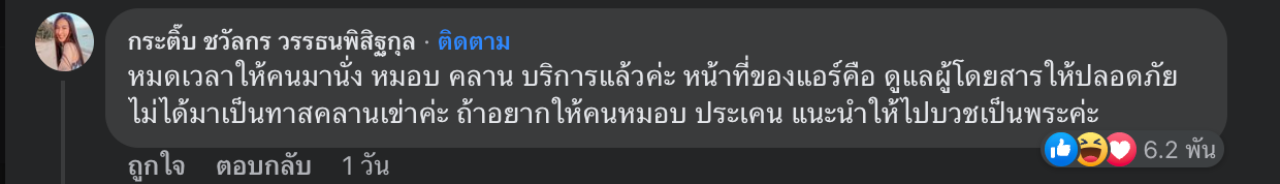 ขณะที่นักแสดงสาวอย่าง "กระติ๊บ ชวัลกร" ก็เข้ามาแสดงความเห็นด้วยว่า "หมดเวลาให้คนมานั่ง หมอบ คลาน บริการแล้วค่ะ หน้าที่ของแอร์คือ ดูแลผู้โดยสารให้ปลอดภัยไม่ได้มาเป็นทาสคลานเข่าค่ะ ถ้าอยากให้คนหมอบ ประเคน แนะนำให้ไปบวชเป็นพระค่ะ".