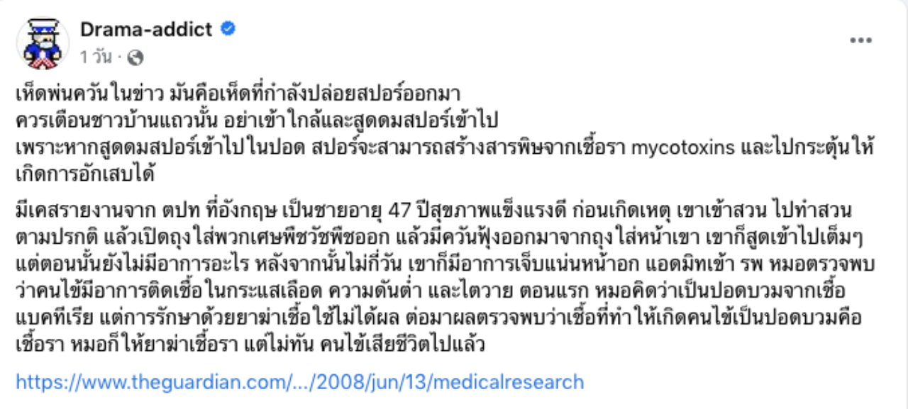 เกี่ยวกับเรื่องนี้ แฟนเพจ Drama-addict ได้ให้ความรู้ว่า เห็ดพ่นควันในข่าว คือเห็ดที่กำลังปล่อยสปอร์ออกมา ควรเตือนชาวบ้านแถวนั้นอย่าเข้าใกล้และสูดดมสปอร์เข้าไป เพราะหากสูดดมสปอร์เข้าไปในปอด สปอร์จะสามารถสร้างสารพิษจากเชื้อรา mycotoxins และไปกระตุ้นให้เกิดการอักเสบได้