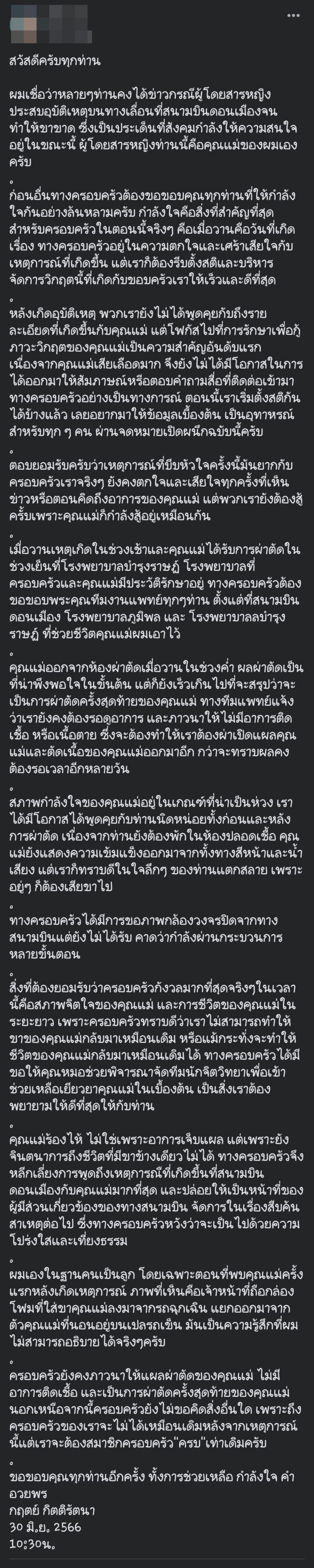 หลังเกิดอุบัติเหตุ พวกเรายังไม่ได้พูดคุยกันถึงรายละเอียดที่เกิดขึ้นกับคุณแม่ แต่โฟกัสไปที่การรักษาเพื่อกู้ภาวะวิกฤติของคุณแม่เป็นความสำคัญอันดับแรก เนื่องจากคุณแม่เสียเลือดมาก จึงยังไม่ได้มีโอกาสในการได้ออกมาให้สัมภาษณ์หรือตอบคำถามสื่อที่ติดต่อเข้ามาทางครอบครัวอย่างเป็นทางการ ตอนนี้เราเริ่มตั้งสติกันได้บ้างแล้ว เลยอยากมาให้ข้อมูลเบื้องต้น เป็นอุทาหรณ์สำหรับทุกๆ คน ผ่านจดหมายเปิดผนึกฉบับนี้ครับ