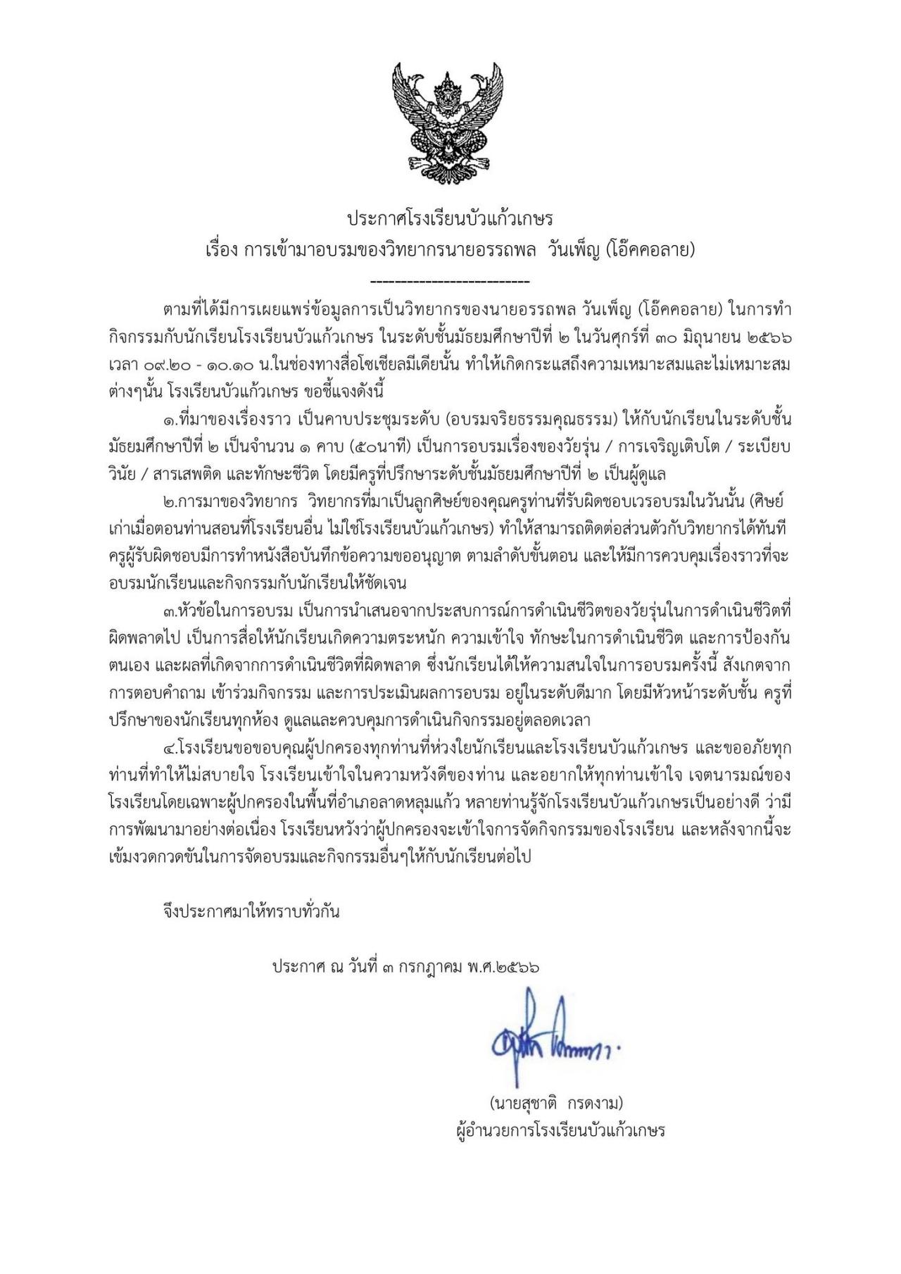 ล่าสุด โรงเรียนบัวแก้วเกษร ได้ออกหนังสือชี้แจงเรื่องดังกล่าว โดยระบุว่า ตามที่ได้มีการเผยแพร่ข้อมูลการเป็นวิทยากร ของนายอรรถพล วันเพ็ญ (โอ๊ตคอลาย) ในการทำกิจกรรมกับนักเรียน โรงเรียนบัวแก้วเกษร ในระดับชั้นมัธยมศึกษาปีที่ 6 ในวันศุกร์ที่ 30 มิถุนายน 2566 เวลา 19.20-10.10 น. ในช่องทางสื่อโซเชียลมีเดียนั้น ทำให้เกิดกระแสถึงความเหมาะสม และไม่เหมาะสมต่างๆ นั้น โรงเรียนบัวแก้วเกษร ขอชี้แจงดังนี้