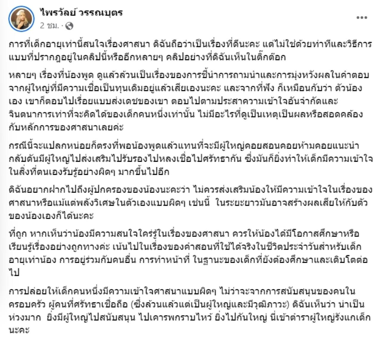 ล่าสุด "แพรรี่" หรือ ไพรวัลย์ วรรณบุตร ได้โพสต์ข้อความผ่านเฟซบุ๊กส่วนตัวกล่าวถึงเรื่องดังกล่าว โดยระบุว่า การที่เด็กอายุเท่านี้ สนใจเรื่องศาสนา ดิฉันถือว่าเป็นเรื่องที่ดีนะคะ แต่ไม่ใช่ด้วยท่าที และวิธีการแบบที่ปรากฎอยู่ในคลิปนี้ หรืออีกหลายๆ คลิปอย่างที่ดิฉันเห็นในติ๊กต๊อก หลายๆ เรื่องที่น้องพูด ดูแล้วล้วนเป็นเรื่องของการชี้นำ การถามนำและการมุ่งหวังผลในคำตอบจากผู้ใหญ่ ที่มีความเชื่อเป็นทุนเดิมอยู่แล้วเสียเองนะคะ