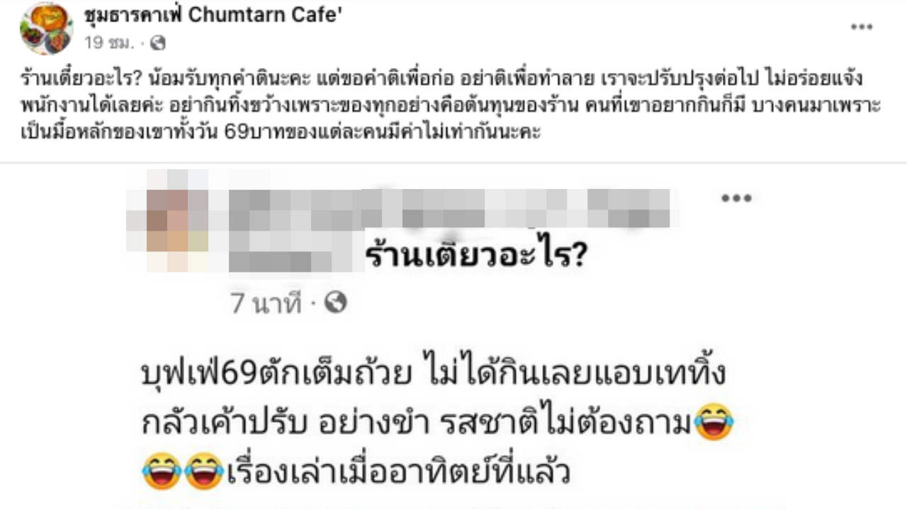 วันที่ 10 ก.ค. 66 เป็นประเด็นในโลกโซเชียล เมื่อผู้ใช้เฟซบุ๊กเพจ "ชุมธารคาเฟ่ Chumtarn Cafe'" ได้แชร์ภาพของผู้ใช้เฟซบุ๊กรายหนึ่ง ซึ่งปักหมุดที่ "ร้านเตี๋ยวอะไร?" โดยมีคำบรรยายในภาพว่า "บุฟเฟต์ 69 ตักเต็มถ้วย ไม่ได้กินเลย แอบเททิ้ง กลัวเขาปรับ อย่างขำ รสชาติไม่ต้องถาม เรื่องเล่าเมื่ออาทิตย์ที่แล้ว"