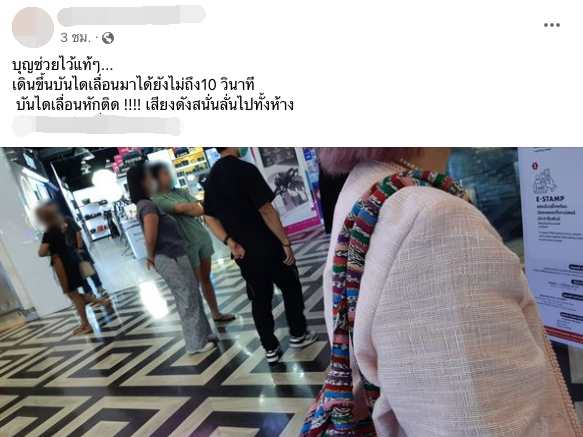 วันที่ 11 กรกฎาคม 2566 ผู้สื่อข่าวรายงานว่า กลายเป็นประเด็นที่สร้างความตกใจให้กับผู้คนในโลกออนไลน์อีกครั้ง เมื่อหนุ่มผู้ใช้เฟซบุ๊กรายหนึ่งได้โพสต์ภาพและคลิปวิดีโอเหตุบันไดเลื่อนในห้างสรรพสินดังแห่งหนึ่งย่านบางนา เกิดชำรุดต่อหน้าต่อตา พร้อมระบุข้อความว่า ต้องมีสติตลอดเวลา กำลังคุยกับลูกค้าอยู่ ต่อหน้าต่อตาเลย ดีที่พี่ผู้ชายกระโดดขึ้นมาทัน หลอนจัด