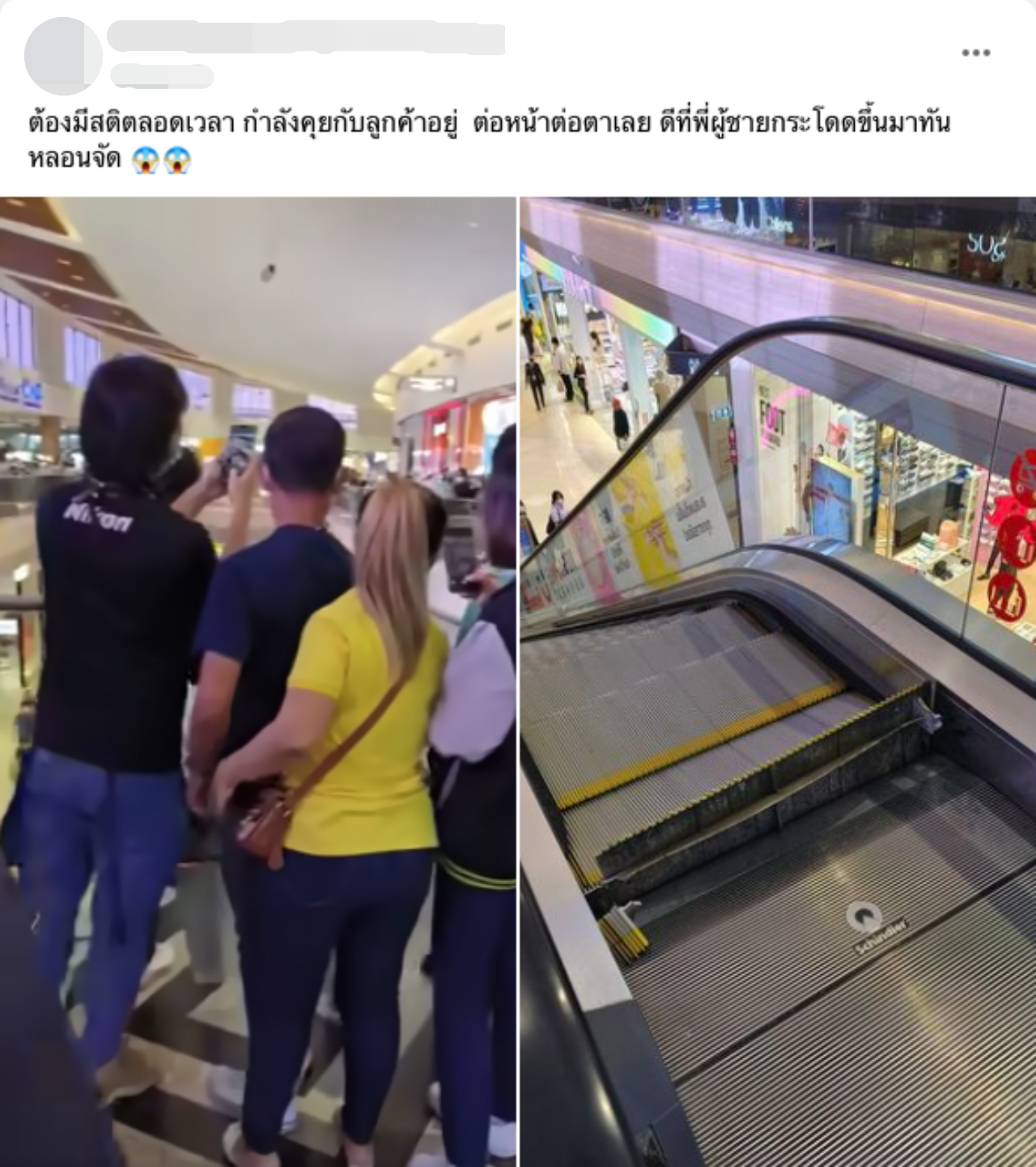 พอเกิดเหตุการณ์ขึ้น เจ้าหน้าที่ก็รีบมาดู แล้วปิดกั้นการใช้งานทันที อยากจะฝากห้างให้หมั่นเช็กความสมบูรณ์ของอุปกรณ์ เพราะคนใช้งานเยอะมาก ถ้าเป็นเสาร์-อาทิตย์ คงน่ากลัวกว่านี้ เพราะคนขึ้นลงทั้งวัน