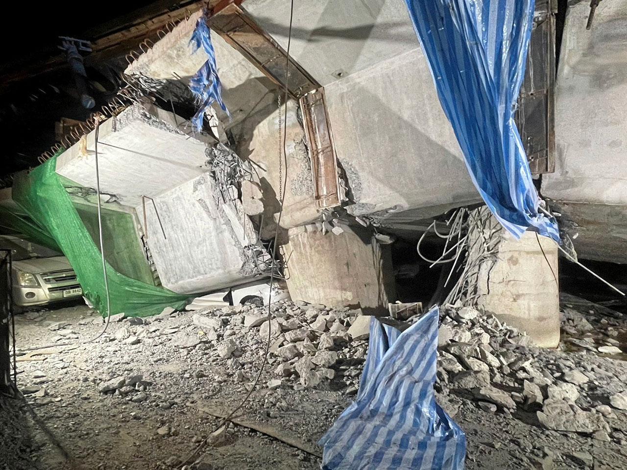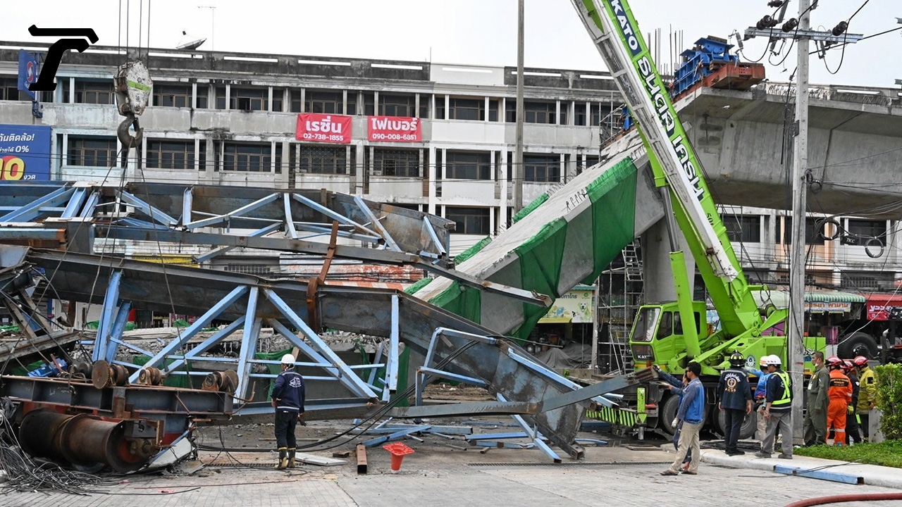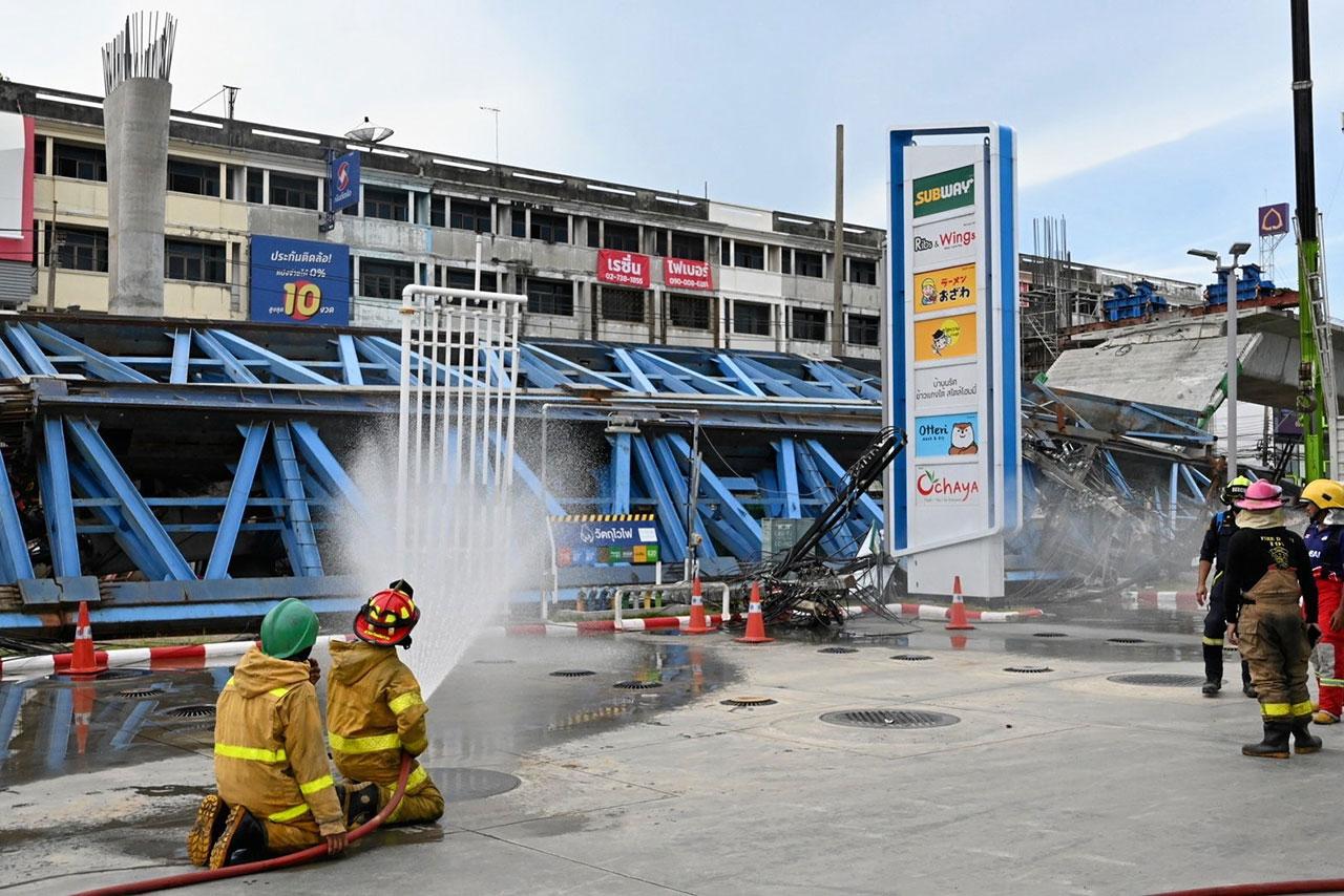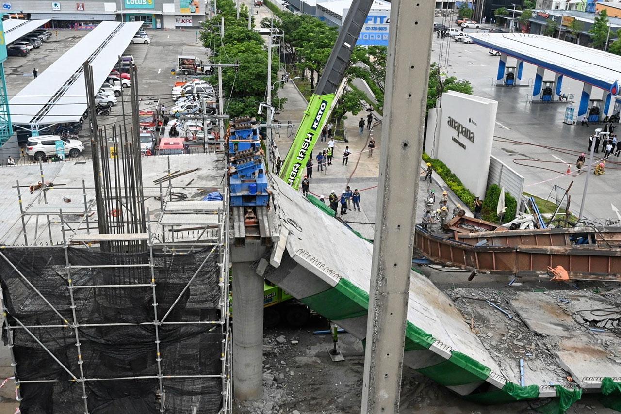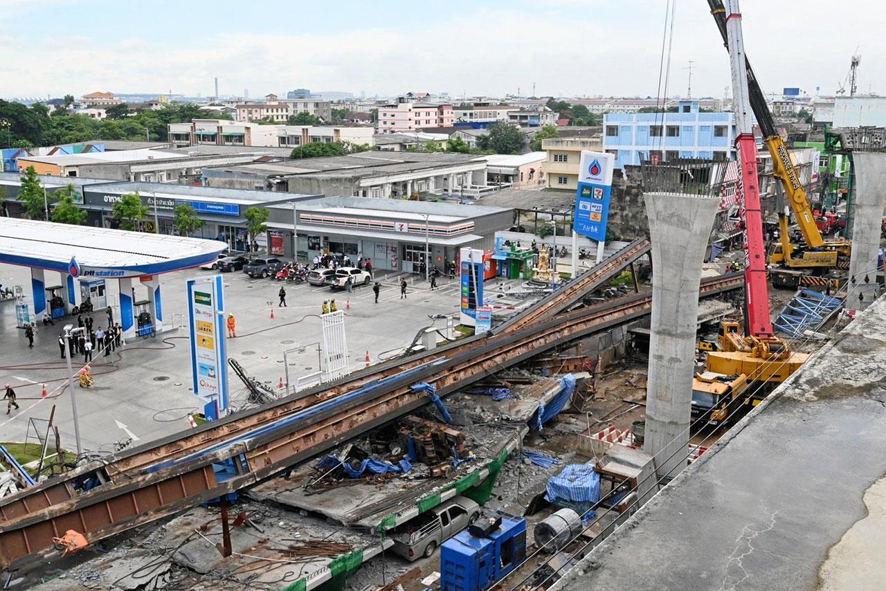 ระดมรถเครนเคลื่อน ย้ายซากคอนกรีตคานทางยกระดับถล่ม คาด 7 วัน นำออกพ้นถนน เผยหวั่นเกิดเหตุระทึกซ้ำ เพราะอยู่ใกล้ปั๊ม ปตท.ที่เพิ่งลงน้ำมันกว่า 1 แสนลิตร ซ้ำมีไอน้ำมันระเหยตลอดเวลา ขณะที่เจ้าหน้าที่ดับเพลิงขอให้มั่นใจวางระบบป้องกันไว้แล้ว 2 ชุด กฟน.เร่งหาแหล่งไฟฟ้าสำรองให้คนในพื้นที่ “ชัชชาติ” เผย “ในหลวง” ทรงรับคนเจ็บเป็นคนไข้ในพระบรมราชานุ เคราะห์ แจงเหตุเบื้องต้นคาด “ลอนเชอร์” อุปกรณ์ยึดตัวสะพานรับน้ำหนักไม่ไหว โวยข่าวไร้สาระ สั่งเปลี่ยนวิธีก่อสร้างจากหล่อคอนกรีตในที่ เป็นนำคอนกรีตหล่อสำเร็จติดตั้งแทน ยันบริษัทรับเหมาขึ้นทะเบียนชั้นดี ส.ก.ลาดกระบังเตรียมยื่นญัตติด่วนถามหาแผนความปลอดภัย จี้สอบเมกะโปรเจกต์ทั่วกรุง
