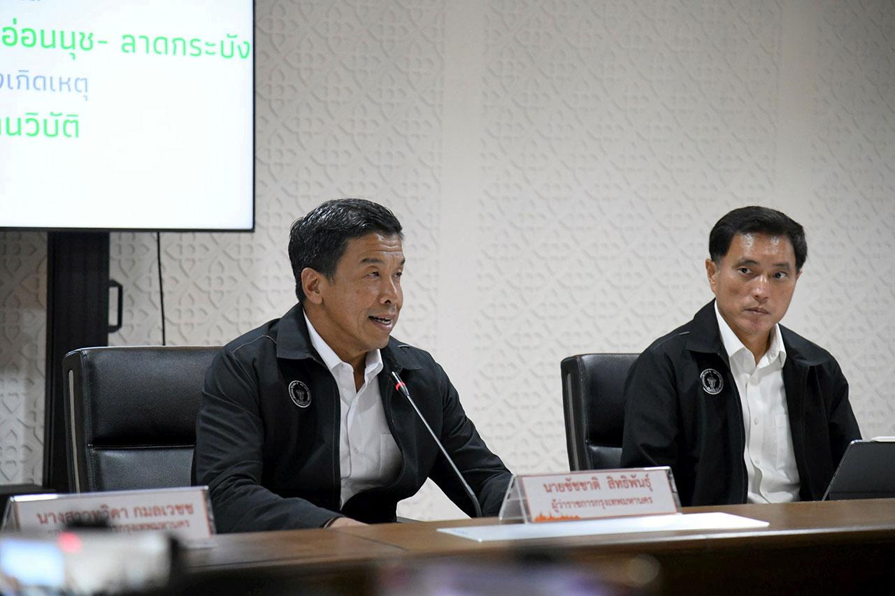อีกด้านหนึ่งเมื่อเวลา 11.20 น. ที่อาคารธานีนพรัตน์ ศาลาว่าการกทม.2 ดินแดง นายชัชชาติ สิทธิพันธุ์ ผู้ว่าฯกทม. นายวิศณุ ทรัพย์สมพล น.ส.ทวิดา กมลเวชช รองผู้ว่าฯ กทม. นายธวัชชัย นภาศักดิ์ศรี ผู้อำนวยการสำนักการโยธา (สนย.) ร่วมแถลงข่าวกรณีคานโครงการก่อสร้างทางยกระดับถนนอ่อนนุช-ลาดกระบัง เขตลาดกระบังพังถล่ม ว่า เกิดเหตุเวลา 17.40 น. วันที่ 10 ก.ค. มีผู้เสียชีวิตที่เกิดเหตุ 1 ราย เสียชีวิตที่โรงพยาบาล 1 ราย และผู้บาดเจ็บอีก 12 ราย โครงการก่อสร้างดังกล่าวผู้รับจ้างกิจการร่วมค้าธาราวัญและนภา ประมูลวงเงิน 1,664,550,000 บาท ต่ำกว่าราคากลาง 1,665,000,000 บาท เพียง 400,000 บาท ผู้รับเหมาดำเนินการ 2 ส่วนคือ ในส่วน launcher และในส่วนผู้รับเหมาดึงลวด ตามสัญญาต้องแล้วเสร็จในต้นเดือน ส.ค.66 แต่ได้รับการขยายสัญญางานไปจนถึง ธ.ค.67 เพราะผลกระทบจากสถานการณ์โควิด ขณะนี้ความก้าวหน้าโครงการถึง มี.ค.66 คืบหน้าไปไม่เกิน 50%