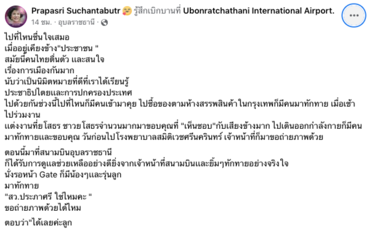 ส.ว.ประภาศรี โพสต์เล่าเหตุการณ์หลังโหวตเห็นชอบให้ "พิธา" ไปที่ไหนชื่นใจเสมอ มีคนเข้ามาคุยทักทาย ให้ความช่วยเหลือ ขอถ่ายภาพด้วย