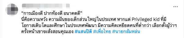 - คุณไม่มีนโยบายเศรษฐกิจที่เป็นไปได้ เพราะนายทุน หรือองค์กรขนาดใหญ่ไม่ต้องการให้คุณมีอำนาจ เกษตรกรต้องการนโยบายที่เขาได้เงินโดยตรง ไม่ใช่แนวคิดเรื่องอุดมการณ์ทางเพศ หรือการปลุกปั่นที่ไร้สาระ