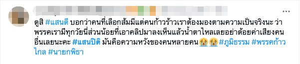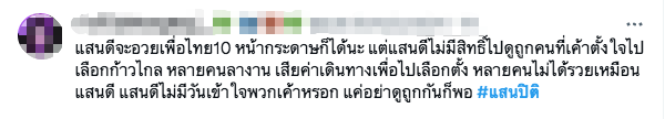 ซึ่งหลังจากข้อความและภาพดังกล่าวถูกเผยแพร่ออกไป ต่างมีคนเข้ามาแสดงความคิดเห็นวิพากษ์วิจารณ์เป็นจำนวนมาก โดยเฉพาะอย่างยิ่งในข้อที่ 8 ที่พูดถึงกลุ่มคนที่ต้องการให้ก้าวไกล เป็นรัฐบาลนั้น มีแค่เพียงกลุ่มเด็กวัยรุ่น ซึ่งส่วนใหญ่มองว่าดูแบบความคิดที่ดูถูกกลุ่มคนที่ตั้งใจไปเลือกตั้ง พร้อมกับติดแฮชแท็ก #แสนปิติ และแฮชแท็ก #แสนดี จนขึ้นเทรนด์ทวิตเตอร์