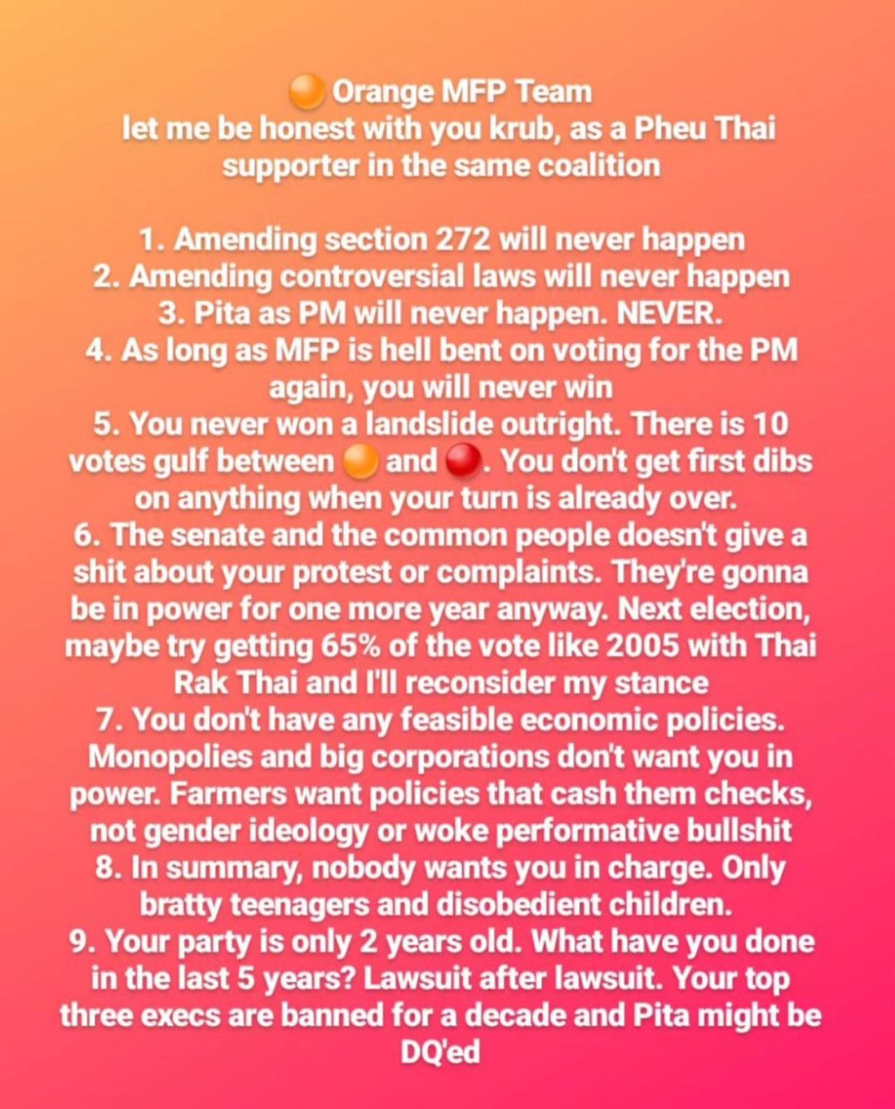 - ตราบใดที่พรรคก้าวไกลยังฝืนส่งพิธาเป็นนายกฯ คุณจะไม่มีวันชนะ