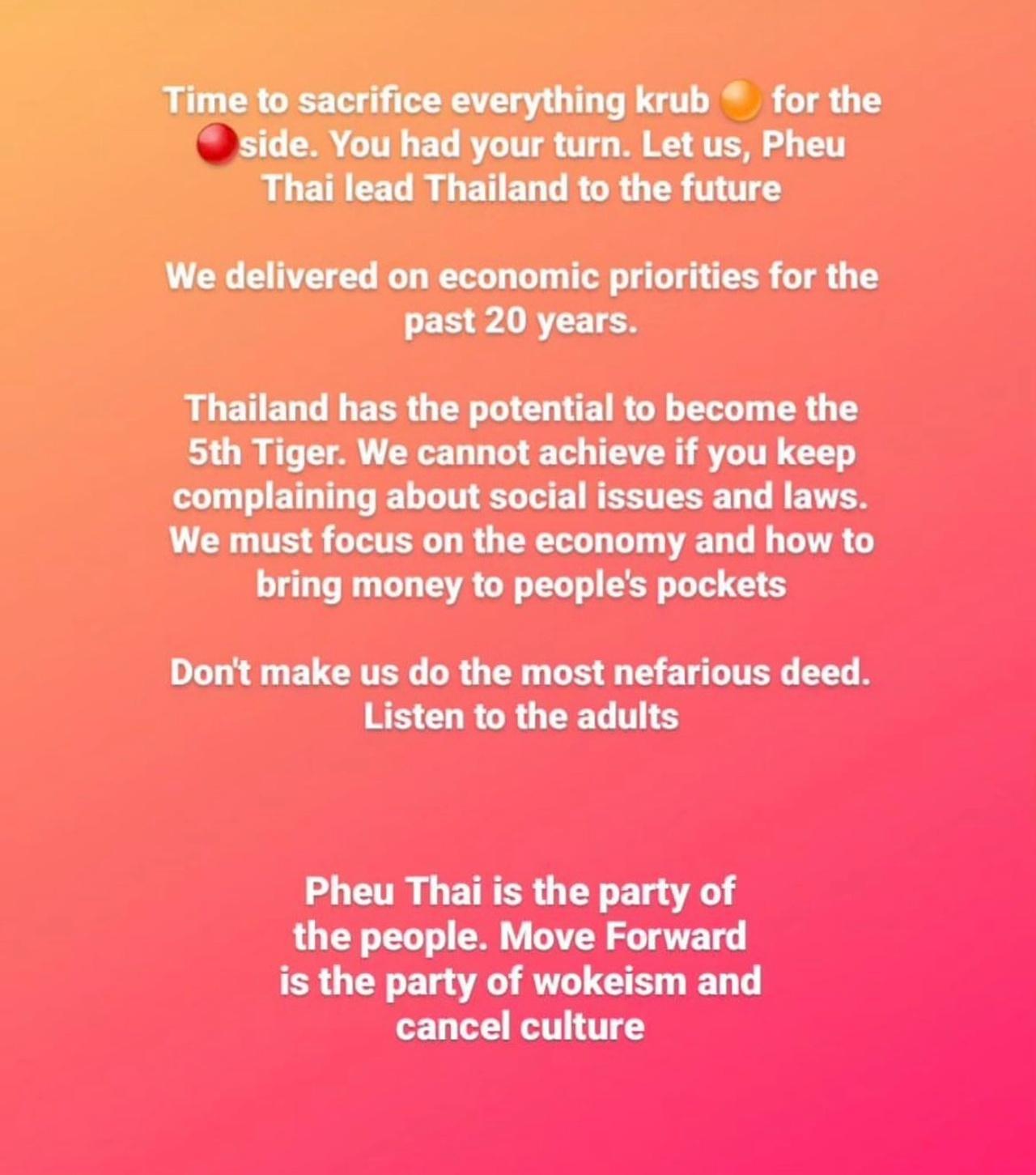 ทั้งนี้ ยังได้กล่าวต่อไปในสตอรี่ถัดไปอีกว่า "พูดให้ชัดขึ้น ผมคิดว่านโยบายพรรคก้าวไกล เป็นอะไรที่มีความเป็นไปได้ มีการเปลี่ยนแปลง และมีความสร้างสรรค์ แต่ผมแค่ไม่ต้องการผู้นำ หรือคนที่เกี่ยวพันกับการประท้วงในปี 2563 ทั้งหมด