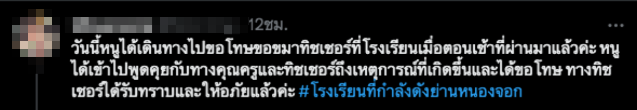 ล่าสุดพบว่า ได้มีผู้ใช้ทวิตเตอร์รายหนึ่งอ้างว่าเป็นเด็กนักเรียนในคลิป ได้เข้าขอขมาครูชาวต่างชาติแล้ว ระบุข้อความว่า “วันนี้หนูได้เดินทางไปขอโทษขอขมาทีชเชอร์ที่โรงเรียนเมื่อตอนเช้าที่ผ่านมาแล้วค่ะ หนูได้เข้าไปพูดคุยกับทางคุณครูและทีชเชอร์ถึงเหตุการณ์ที่เกิดขึ้นและได้ขอโทษ ทางทีชเชอร์ได้รับทราบและให้อภัยแล้วค่ะ #โรงเรียนที่กำลังดังย่านหนองจอก”
