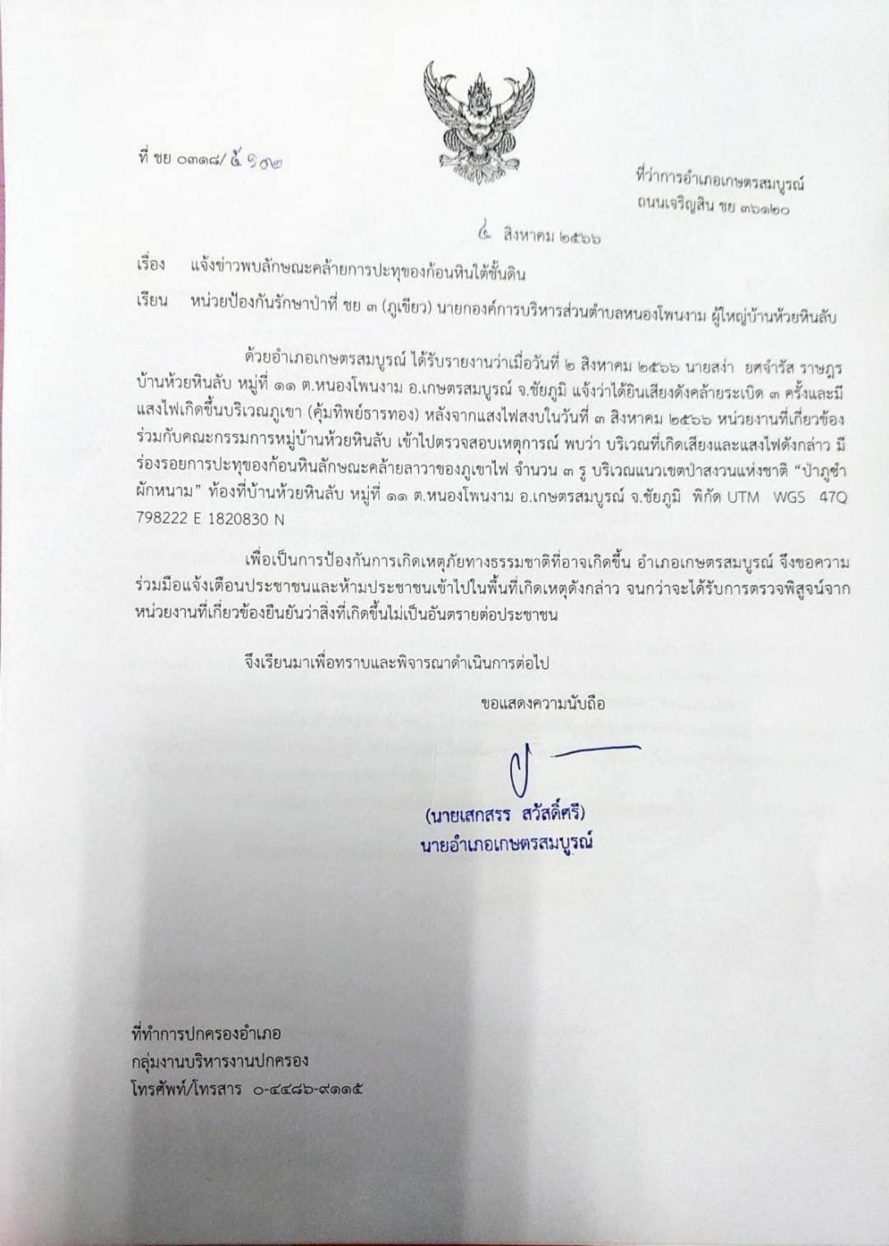 วันที่ 5 สิงหาคม 2566 มีรายงานว่า ปภ.ชัยภูมิ ติดตามความคืบหน้ากรณีที่มีการเสนอข่าว ว่า พบการปะทุของก้อนหินใต้ดินในพื้นที่จังหวัดชัยภูมิ เมื่อช่วงกลางดึกของคืนวันที่ 2 สิงหาคม 2566 ที่ผ่านมา ซึ่งในายสง่า ยศจำรัส ชาวบ้านในหมู่บ้านห้วยหินลับ ม.11 ต.หนองโพนงาม อ.เกษตรสมบูรณ์ จ.ชัยภูมิ ได้แจ้งว่า ได้ยินเสียงดังคล้ายระเบิด 3 ครั้ง และมีแสงไฟเกิดขึ้นบนภูเขา (คุ้มทิพย์ธารทอง) โดยเมื่อวันที่ 3 สิงหาคม 2566 มีหน่วยงานที่เกี่ยวข้องลงพื้นที่ทำการตรวจสอบพบร่องรอยการปะทุของก้อนหินคล้ายลาวาภูเขาไฟ จำนวน 3 รู