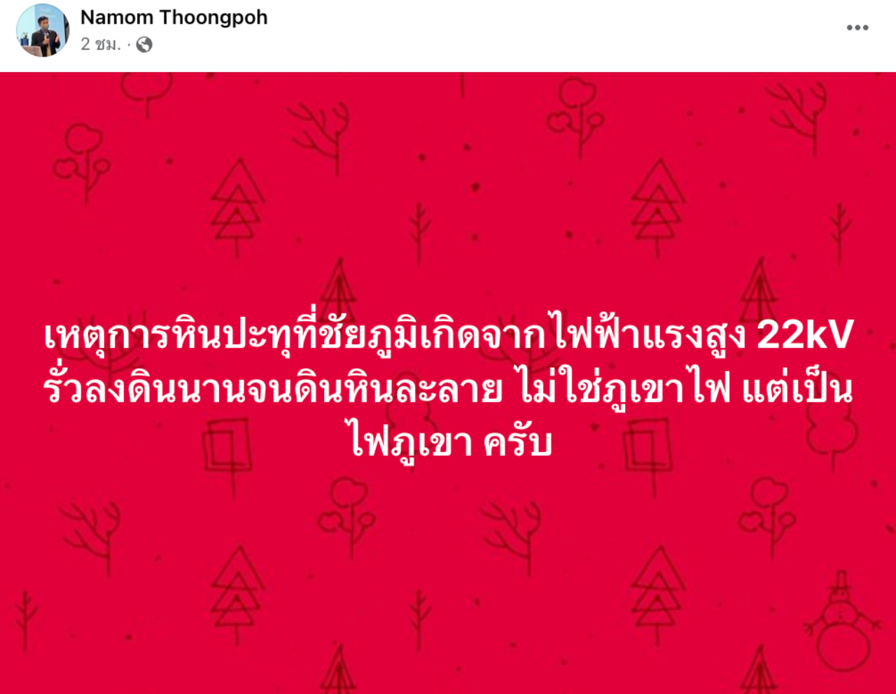 ขณะที่ ดร.ไพบูลย์ นวลนิล นักแผ่นดินไหววิทยา คณะวิทยาศาสตร์ มหาวิทยาลัยสงขลานครินทร์ วิทยาเขตหาดใหญ่ ได้โพสต์ข้อความผ่านเฟซบุ๊ก Namom Thoongpoh ว่า เหตุการณ์หินปะทุที่ชัยภูมิ เกิดจากไฟฟ้าแรงสูง 22kV รั่วลงดินนานจนดินหินละลาย ไม่ใช่ภูเขาไฟ แต่เป็นไฟภูเขา ครับ