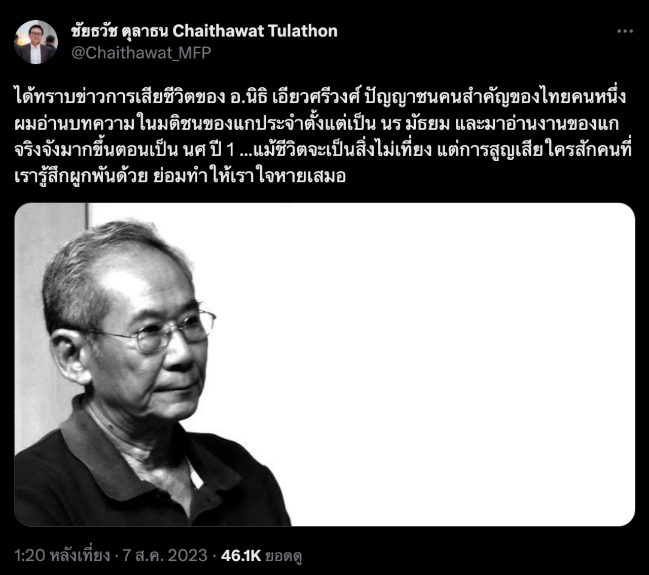 วันที่ 7 ส.ค. 2566 ผู้สื่อข่าวรายงานว่า นายชัยธวัช ตุลาธน เลขาธิการพรรคก้าวไกล ได้โพสต์ข้อความผ่านทวิตเตอร์ โดยระบุว่า "ได้ทราบข่าวการเสียชีวิตของ อ.นิธิ เอียวศรีวงศ์ ปัญญาชนคนสำคัญของไทยคนหนึ่ง ผมอ่านบทความของแกประจำตั้งแต่เป็น นักเรียนมัธยม และมาอ่านงานของแกจริงจังมากขึ้นตอนเป็น นักศึกษาปี 1 แม้ชีวิตจะเป็นสิ่งไม่เที่ยง แต่การสูญเสียใครสักคนที่เรารู้สึกผูกพันด้วย ย่อมทำให้เราใจหายเสมอ"