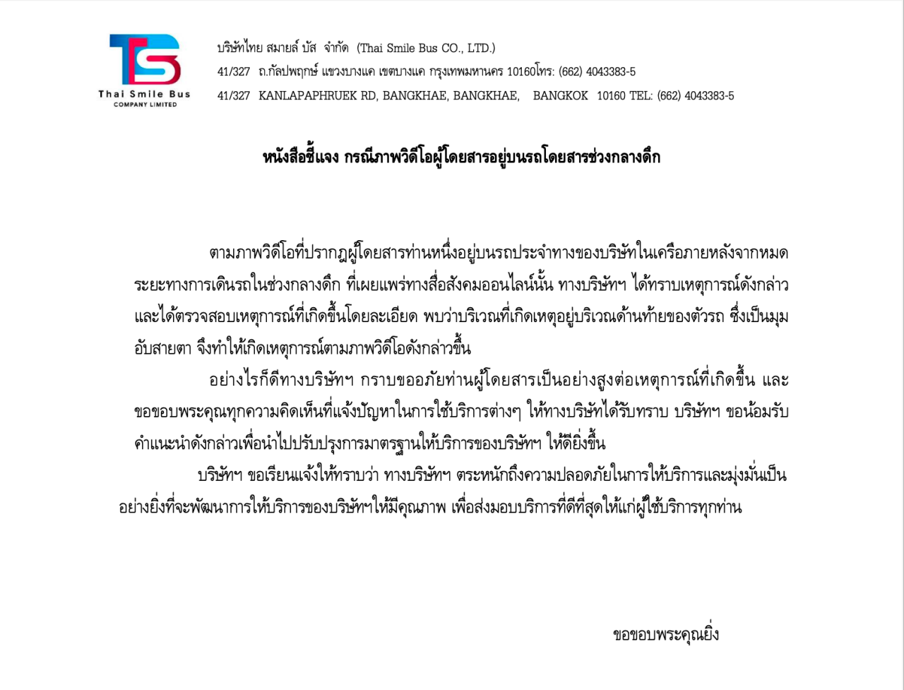 อย่างไรก็ดี ทางบริษัทฯ กราบขออภัยท่านผู้โดยสารเป็นอย่างสูงต่อเหตุการณ์ที่เกิดขึ้น และขอขอบพระคุณทุกความคิดเห็นที่แจ้งปัญหาในการใช้บริการต่างๆ ให้ทางบริษัทได้รับทราบ บริษัทฯ ขอน้อมรับคำแนะนำดังกล่าวเพื่อนำไปปรับปรุงการมาตรฐานให้บริการของบริษัทฯ ให้ดียิ่งขึ้น