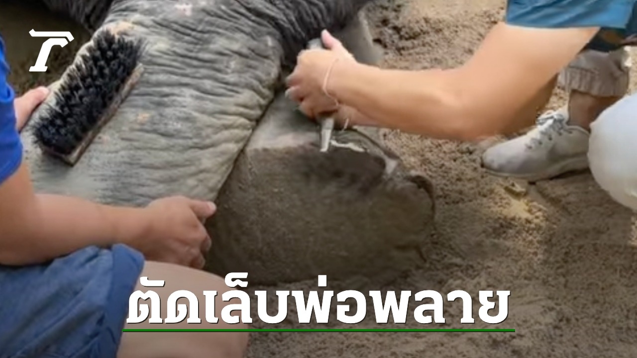 ทีมสัตวแพทย์ และควาญ ช่วยกันตัดเล็บเท้า "พลายศักดิ์สุรินทร์" หลังยืนบนพื้นแข็งนานทำเล็บบิดเบี้ยว ติดเชื้อรา ขณะที่พ่อพลาย นอนสบายให้คนทำเล็บให้