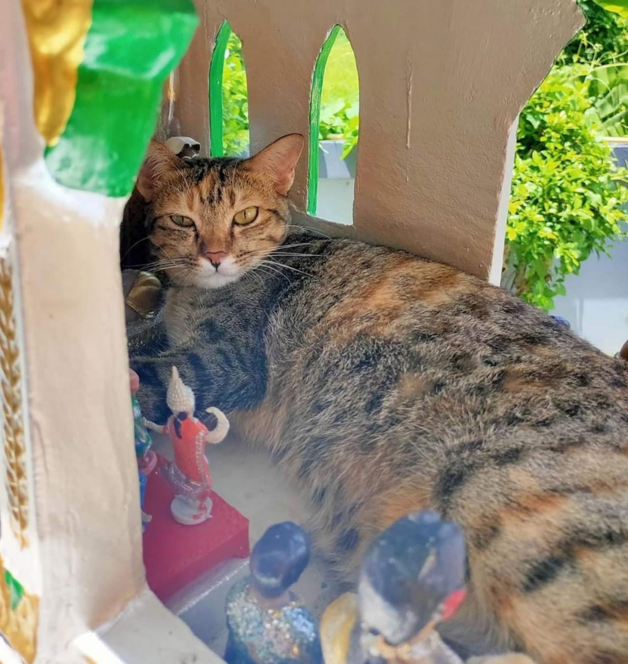ซึ่งที่พักเราอนุญาตให้เลี้ยงสัตว์ตัวเล็กได้ภายในห้องพัก แต่พอวันนึงมีลูกค้ารายวันมาเข้าพัก เลยจะแวะกราบศาลตายายก่อนเข้าพัก แล้วลูกค้าคงเจอกับแมวของเรา ที่เข้าไปนอนอยู่ในศาลตายายเป็นประจำ บางวันไปนอนเบียดกัน 3 ตัวแม่ลูกเลย ลูกค้าเลยแจ้งมาทางเราว่า ทำไมที่พักให้แมวขึ้นไปนอนแบบนั้นคะ มันไม่ดี มันเป็นการลบหลู่ตายายและสิ่งศักดิ์สิทธิ์นะคะ