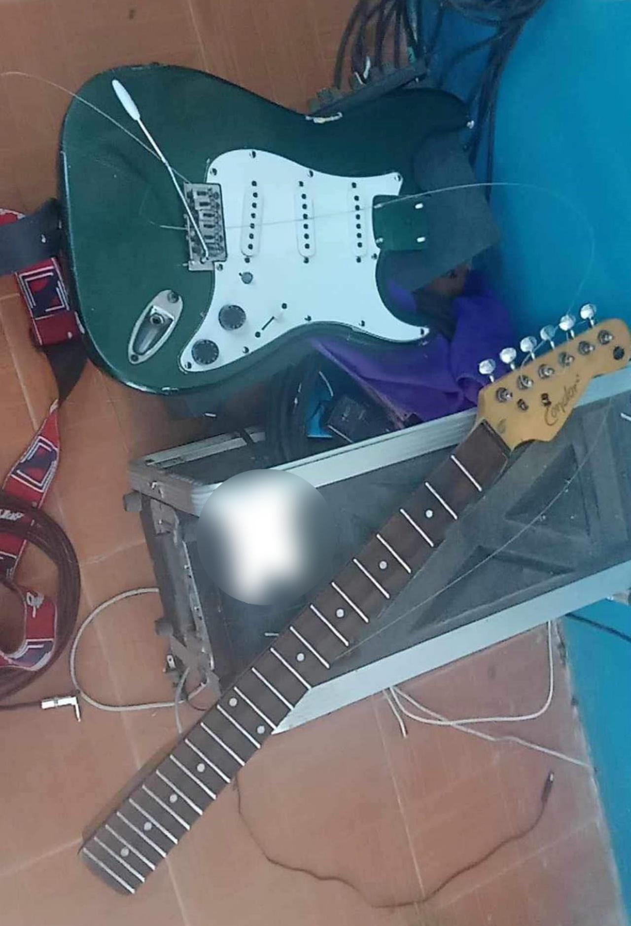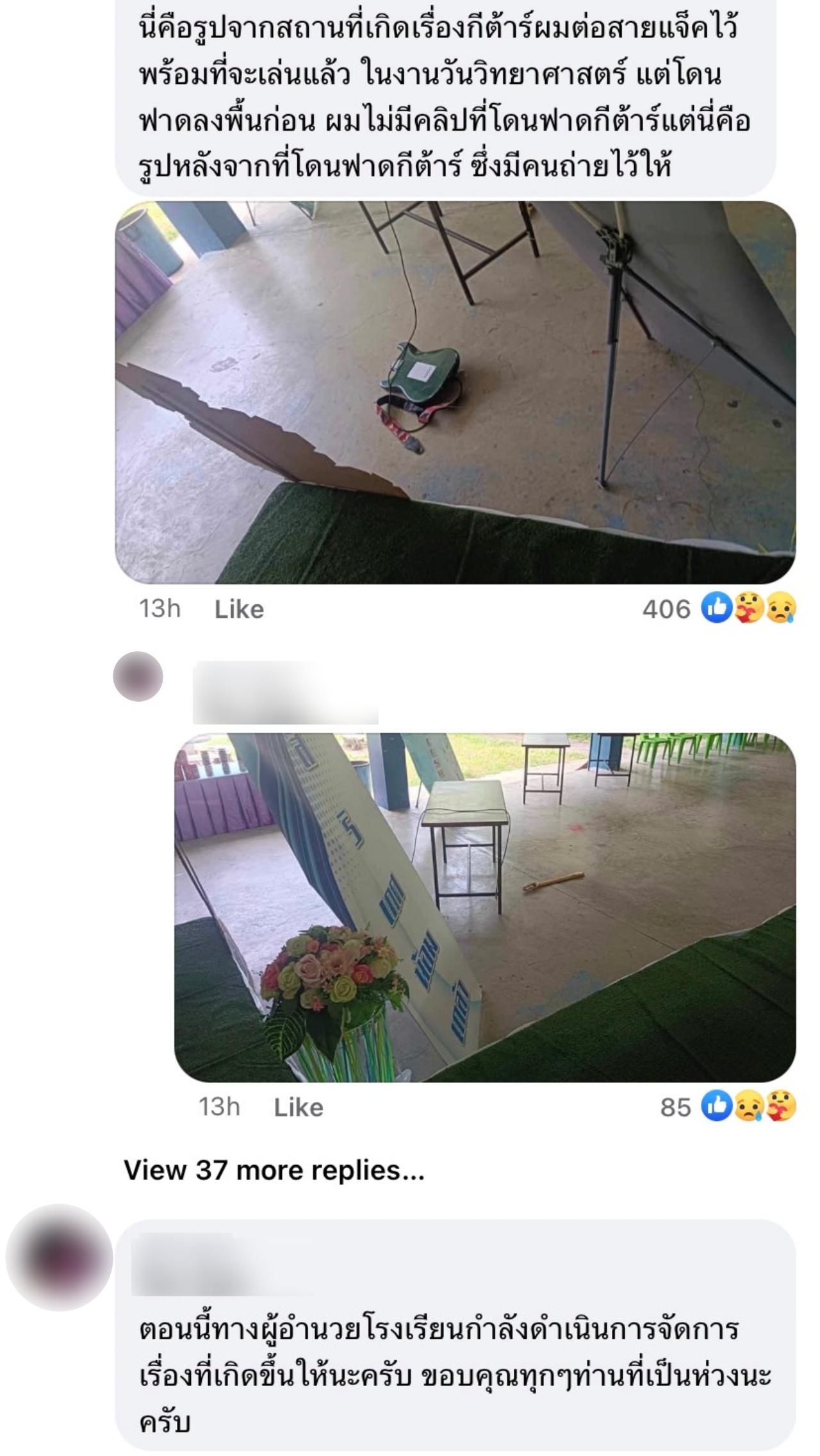 พร้อมทั้งอัปเดตเพิ่มเติมอีกว่า นี่คือรูปจากสถานที่เกิดเรื่อง กีต้าร์ผมต่อสายแจ็คไว้พร้อมที่จะเล่นแล้ว ในงานวันวิทยาศาสตร์ แต่โดนฟาดลงพื้นก่อน ผมไม่มีคลิปที่โดนฟาดกีต้าร์ แต่นี่คือรูปหลังจากที่โดนฟาดกีต้าร์ ซึ่งมีคนถ่ายไว้ให้ ตอนนี้ทางผู้อำนวยโรงเรียน กำลังดำเนินการจัดการเรื่องที่เกิดขึ้นให้ ขอบคุณทุกๆ ท่านที่เป็นห่วงนะครับ