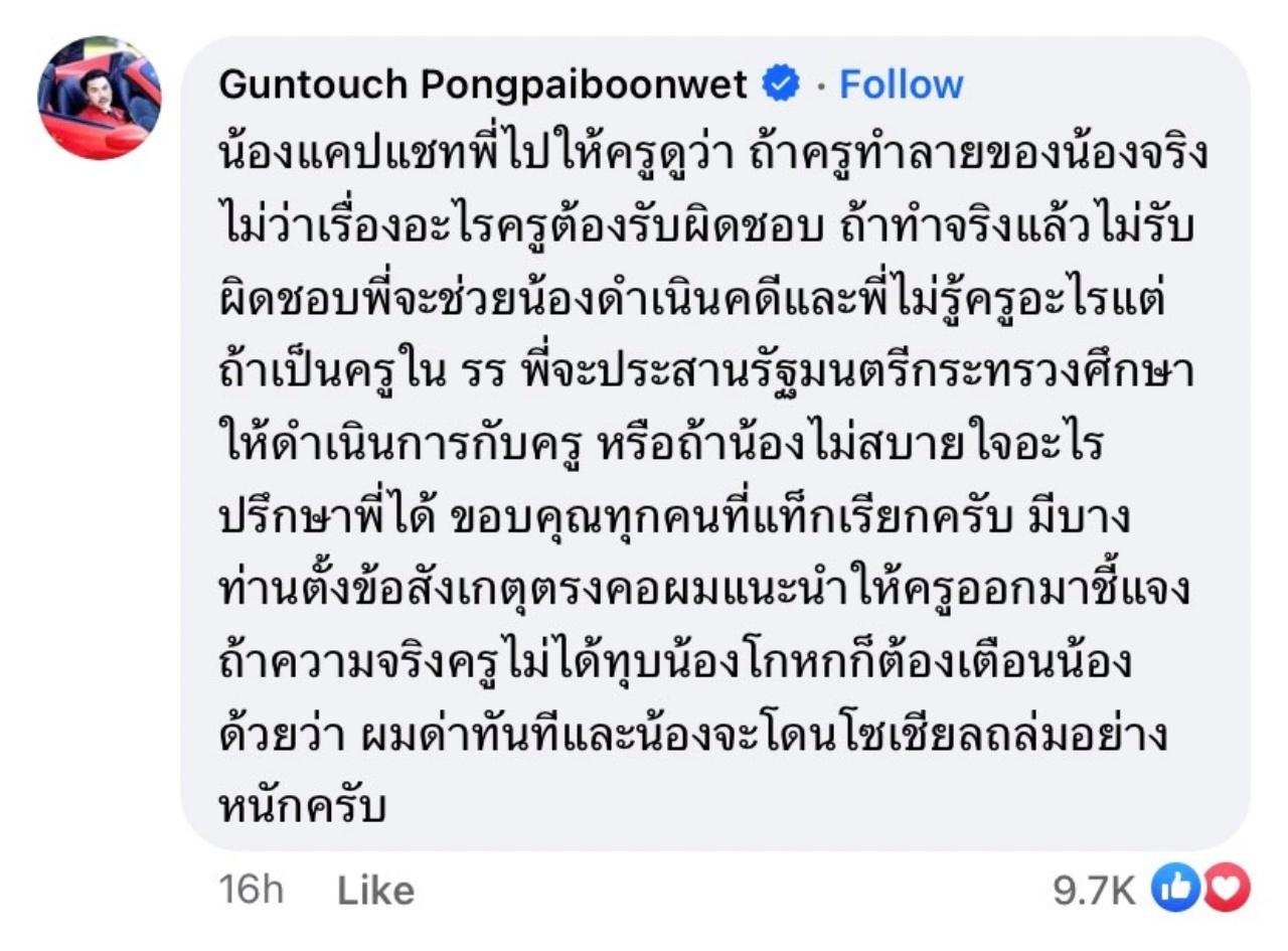 หรือถ้าน้องไม่สบายใจอะไร ปรึกษาพี่ได้ ขอบคุณทุกคนที่แท็กเรียกครับ มีบางท่านตั้งข้อสังเกตตรงคอ ผมแนะนำให้ครูออกมาชี้แจง ถ้าความจริงครูไม่ได้ทุบ น้องโกหก ก็ต้องเตือนน้องด้วยว่า ผมด่าทันที และน้องจะโดนโซเชียลถล่มอย่างหนักครับ