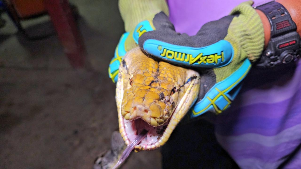 ที่เกิดเหตุเป็นเล้าไก่อยู่บริเวณข้างบ้าน ภายในพบงูเหลือมขนาดใหญ่ ความยาวราว 4 เมตร กำลังนอนขดตัว หลังเขมือบกินไก่เข้าไปเกลี้ยงเล้าจนพุงกาง ไม่สามารถเคลื่อนตัวหนีไปไหนได้ เบื้องต้น กู้ภัยได้นำอุปกรณ์จับอสรพิษชนิดห่วงเชือก เข้าทำการคล้องคองูไว้ได้ ก่อนกระตุกเงื่อนจับกุมตัวไว้ได้สำเร็จ