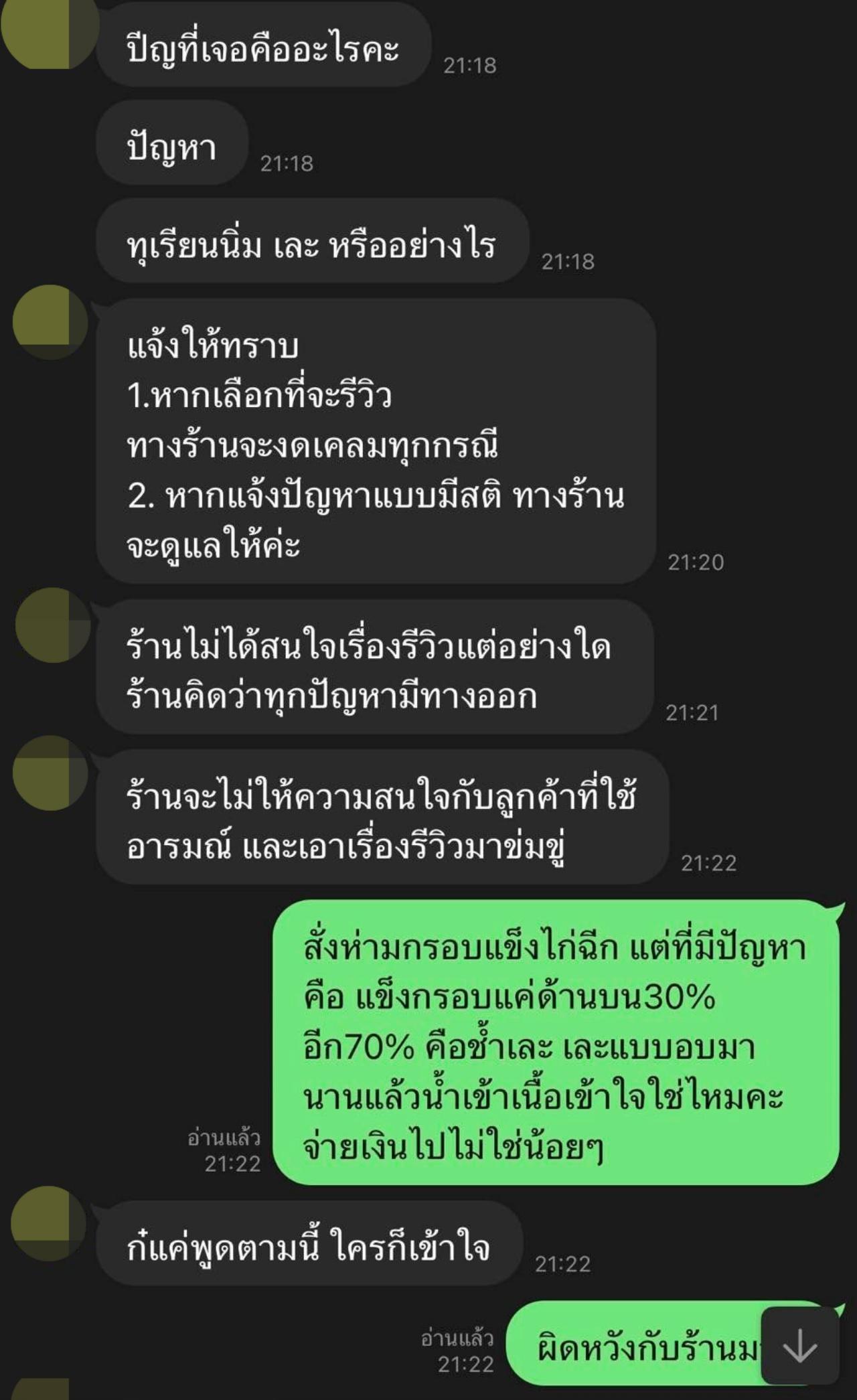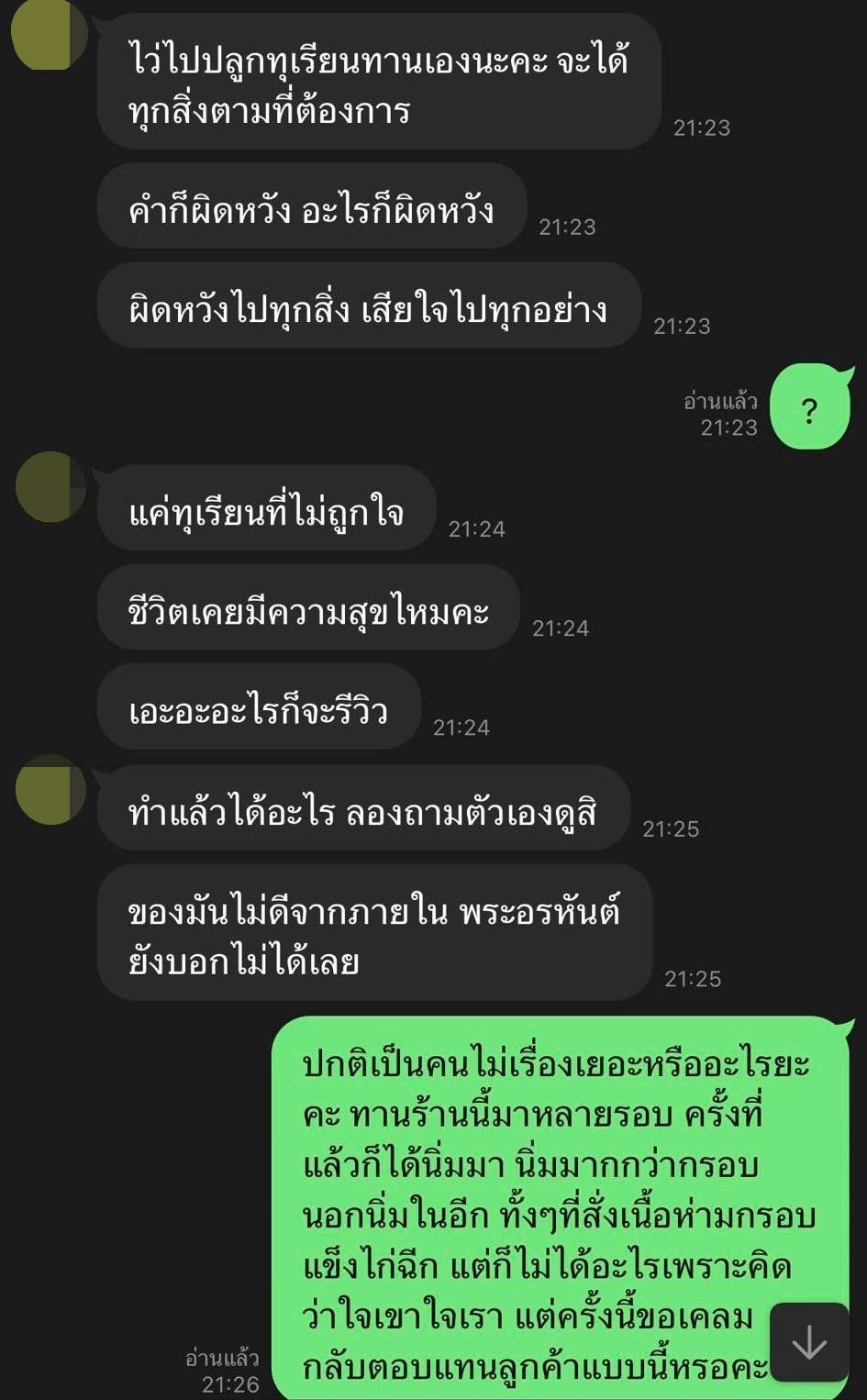 - เจตนาในการโพสต์ครั้งนี้ คือ การตอบแชตของเจ้าของร้านที่มีวุฒิภาวะต่ำ service mind ที่ควรมีกับลูกค้าทุกคน ไม่ว่าจะถูกใจหรือไม่ คุณก็ไม่ควรแสดงพฤติกรรมแบบนี้กับใครทั้งนั้น ลูกค้าคาดหวังในสินค้าเป็นเรื่องปกติ ซื้อของใครก็อยากได้ของตามที่ตัวเองสั่ง