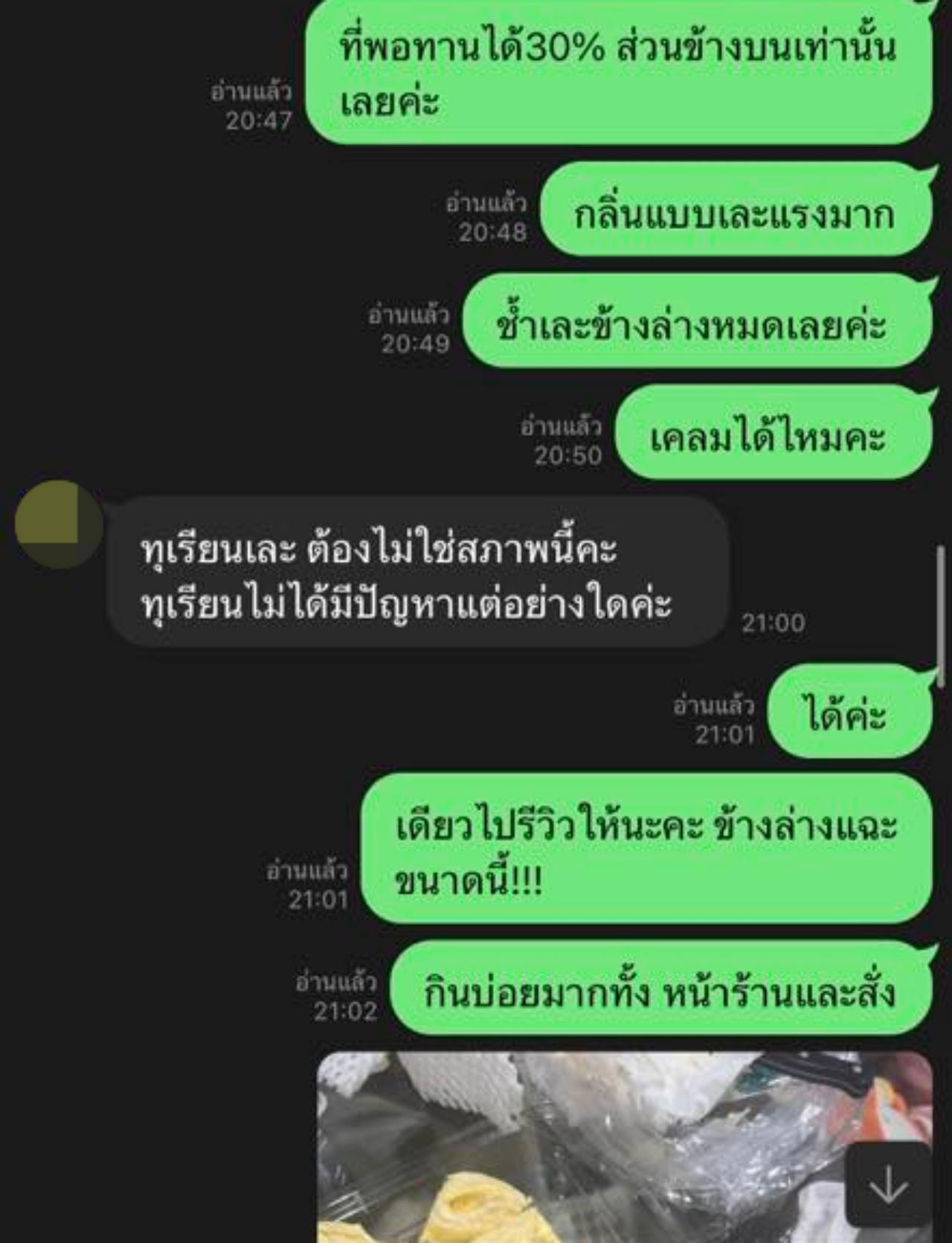 - เราได้ถ่ายรูปเพิ่มเติม ในส่วนทุเรียนที่มีปัญหาส่งให้ทางร้านเพิ่มเติม เพื่อให้เห็นว่าเนื้อทุเรียนนิ่ม และเละอมน้ำแฉะเหม็น โดยแยกในส่วนที่ทานได้ ทานไม่ได้ และอธิบายให้ทางร้านทราบเพิ่มเติมซึ่งปรากฏตามรูปในแชต