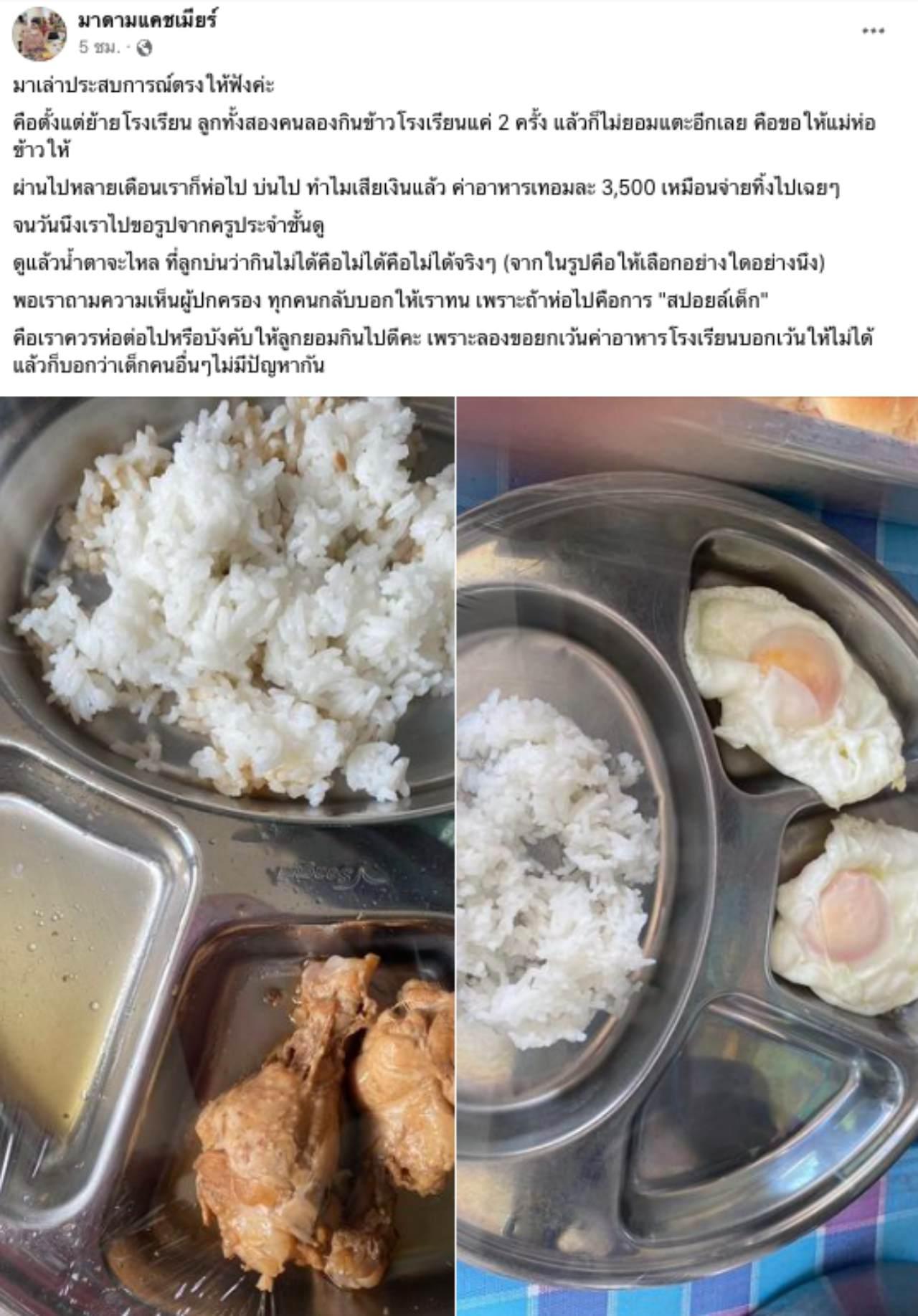 สำหรับลูกๆ อายุ 8 ขวบ กับ 12 ขวบ ซึ่งคนโตให้ซื้อกินเองแล้ว มีแต่คนเล็กที่โดนเก็บค่าอาหาร โดยได้สอบถามเขาแล้วว่า ถ้าคืนค่าอาหารไม่ได้ ให้นำเงินไปหักลบค่าอื่นแทนได้มั้ย แต่เขาก็บอกว่าไม่ได้จริงๆ ล่าสุดก็ได้คุยกับนายกสมาคมผู้ปกครองของโรงเรียนนี้ ซึ่งเขาก็บอกว่าต้องทนเพราะเป็นการฝึกเด็ก ซึ่งรู้สึกว่ามันน่าเกลียดในการได้ข้าวไข่ดาวในถาดเดียว ถ้ามีทั้งไก่และไข่ยังพอรับได้