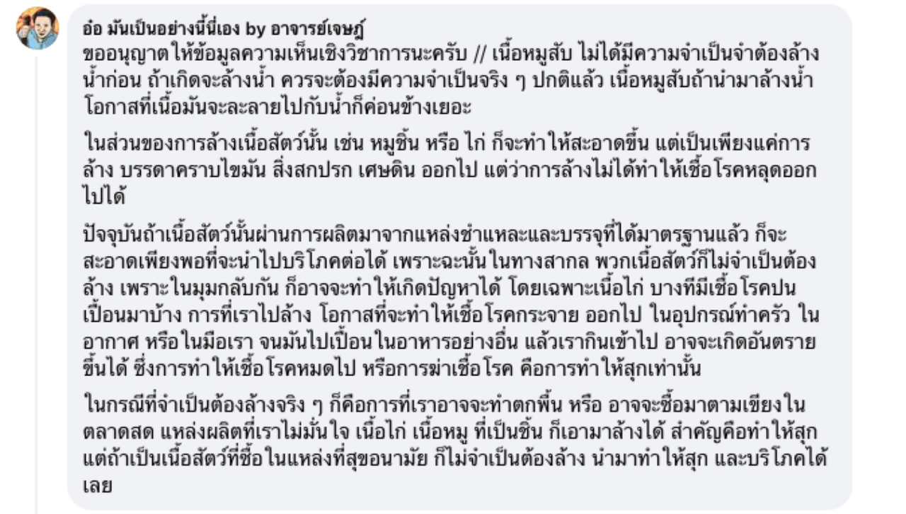 ขณะที่ ศ.ดร.เจษฎา เด่นดวงบริพันธ์ อาจารย์ประจำภาควิชาชีววิทยา คณะวิทยาศาสตร์ จุฬาลงกรณ์มหาวิทยาลัย และนักสื่อสารวิทยาศาสตร์ ได้เข้ามาโพสต์ข้อความแสดงความคิดเห็นพร้อมระบุว่า ขออนุญาตให้ข้อมูลความเห็นเชิงวิชาการนะครับ เนื้อหมูสับไม่ได้มีความจำเป็นต้องล้างน้ำก่อน ถ้าเกิดจะล้างน้ำควรจะต้องมีความจำเป็นจริงๆ ปกติแล้ว เนื้อหมูสับถ้านำมาล้างน้ำ โอกาสที่เนื้อมันจะละลายไปกับน้ำก็ค่อนข้างเยอะ ในส่วนของการล้างเนื้อสัตว์นั้น เช่น หมูชิ้น หรือ ไก่ ก็จะทำให้สะอาดขึ้น แต่เป็นเพียงแค่การล้าง บรรดาคราบไขมัน สิ่งสกปรก เศษดิน ออกไป แต่ว่าการล้างไม่ได้ทำให้เชื้อโรคหลุดออกไปได้