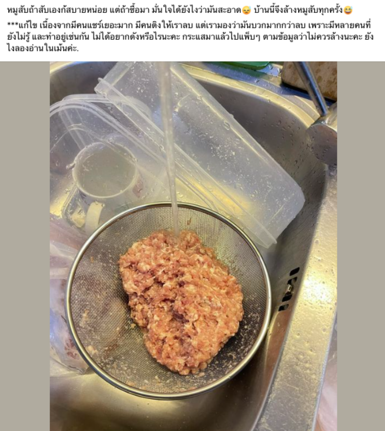 ทั้งนี้ หลังจากโพสต์ดังกล่าวถูกเผยแพร่ออกไป ก็มีคนเข้ามาคอมเมนต์แสดงความคิดเห็นกันเป็นจำนวนมาก โดยมีทั้งคนที่เห็นด้วยและไม่เห็นด้วย อาทิ เค้าไม่ล้างกันจ้ะ เนื้อสัตว์ มันกระจายแบคทีเรีย เอาไป cook สุกๆก็พอ, มั่นใจว่าน้ำก๊อกสะอาดกว่าหมูใช่มั้ย, ล้างเหมือนกัน นึกว่าเป็นคนเดียว, เชื้อโรคกระจายเต็มอ่าง ละอองน้ำกระเซ็นไปได้อีกไกล ถ้าจะล้าง ต้องหาที่คลุมภาชนะอื่นๆ ด้วย