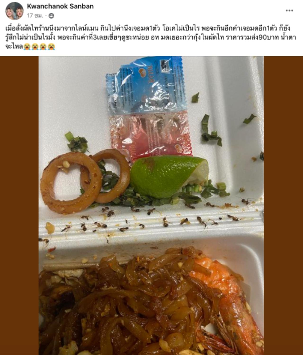 โดยระบุข้อความว่า เมื่อสั่งผัดไทยร้านหนึ่งมาจากไลน์แมน กินไปคำหนึ่งเจอมด 1 ตัว โอเคไม่เป็นไร พอจะกินอีกคำเจอมดอีก 1 ตัว ก็ยังรู้สึกไม่น่าเป็นไรมั้ง พอจะกินคำที่ 3 เลยเขี่ยๆ ดูซะหน่อย อห มดเยอะกว่ากุ้งในผัดไท ราคารวมส่ง 90 บาท น้ำตาจะไหล
