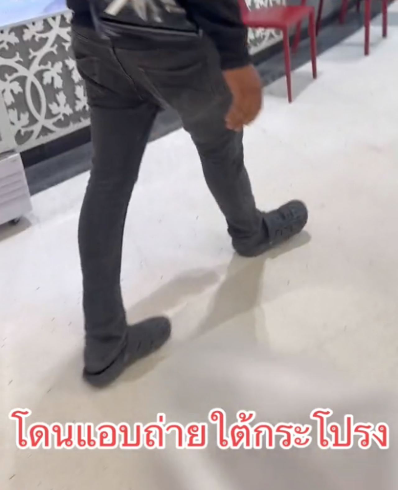 จึงเริ่มสงสัยว่าทำไมถึงยังตามมา แต่ไม่ยอมซื้อของ พอสังเกตตรงรองเท้าก็เห็นว่ามันนูนขึ้น และเห็นเหมือนเลนส์กล้องสะท้อนแสง ถามเขาว่าแอบถ่ายตนเหรอ เขาก็ปฏิเสธ จึงเดินตามและโวยวายเสียงดังให้คนอื่นช่วย จนพี่ตำรวจ สภ.เมืองฉะเชิงเทรา และพลเมืองดีได้ยินเสียง ได้เข้ามาช่วยจับกุมตัว