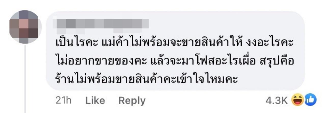 แน่นอนว่า หลังจากเรื่องราวดังกล่าวถูกเผยแพร่ออกไป ก็ทำเอาคนในโลกโซเชียลงงไปตามๆ กัน แห่คอมเมนต์สนั่น เตือนแม่ค้าให้ตั้งสติดีๆ ทั้งยังแนะนำอีกว่า หากยังไม่พร้อมขาย ก็ไม่ควรมาคอมเมนต์ฝากร้านในโพสต์ของคนที่กำลังตามหา เพราะลูกค้าทุกคน ก็เข้าใจในทำนองเดียวกันว่ามีของพร้อมส่ง.