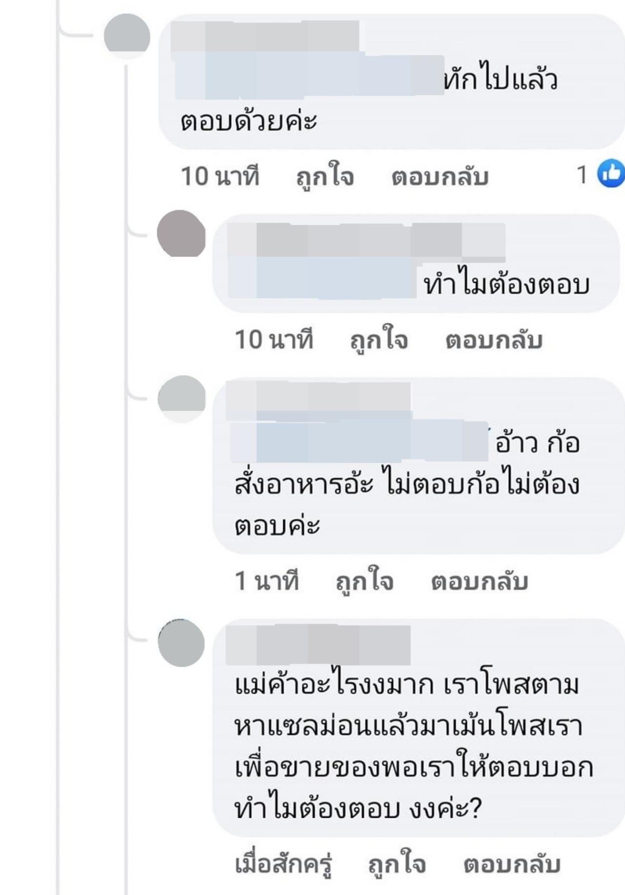 พร้อมกับโชว์ข้อความที่แม่ค้าคอมเมนต์ ตอบกลับในโพสต์ ระบุว่า "ทำไมต้องตอบ" ซึ่งทางเจ้าของโพสต์ก็พยายามอธิบายไปว่า ตนเองทักเพื่อจะสั่งอาหาร หากไม่ตอบ ก็ไม่ต้องตอบ แต่แม่ค้ามางงอะไร เพราะเป็นคนมาคอมเมนต์ขายแซลมอน ในโพสต์ของเธอเอง
