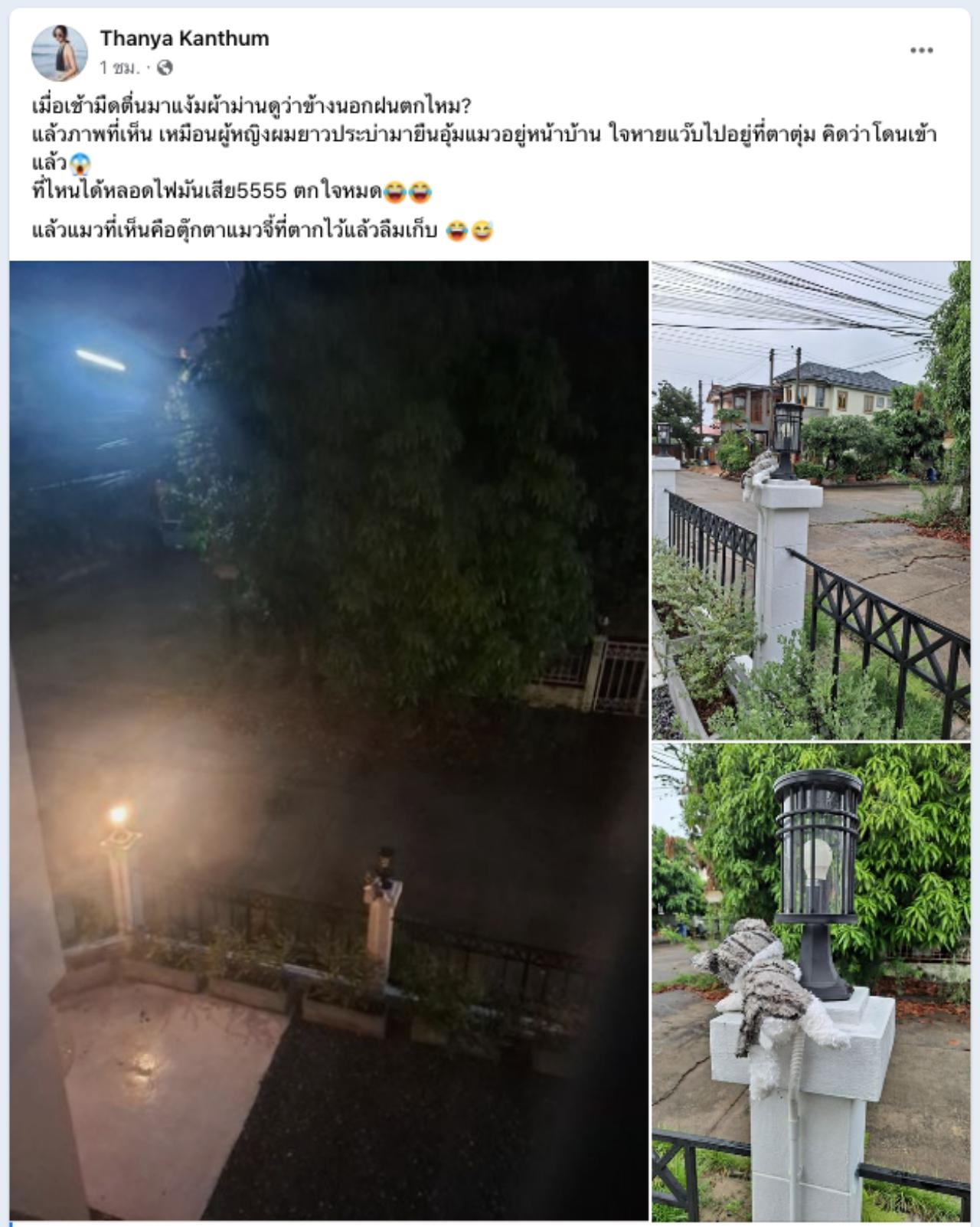 วันที่ 18 กันยายน 2566 มีรายงานว่า โลกออนไลน์ได้ให้ความสนใจเรื่องราวจากผู้ใช้เฟซบุ๊ก Thanya Kanthum ที่ได้โพสต์ภาพบริเวณหน้าบ้าน ลงในกลุ่ม งานบ้านที่รัก พร้อมข้อความระบุว่า เมื่อเช้ามืดตื่นมาแง้มผ้าม่านดูว่าข้างนอกฝนตกไหม? แล้วภาพที่เห็น เหมือนผู้หญิงผมยาวประบ่ามายืนอุ้มแมวอยู่หน้าบ้าน ใจหายแว๊บไปอยู่ที่ตาตุ่ม คิดว่าโดนเข้าแล้ว ที่ไหนได้หลอดไฟมันเสีย5555 ตกใจหมด แล้วแมวที่เห็นคือตุ๊กตาแมวจี้ที่ตากไว้แล้วลืมเก็บ