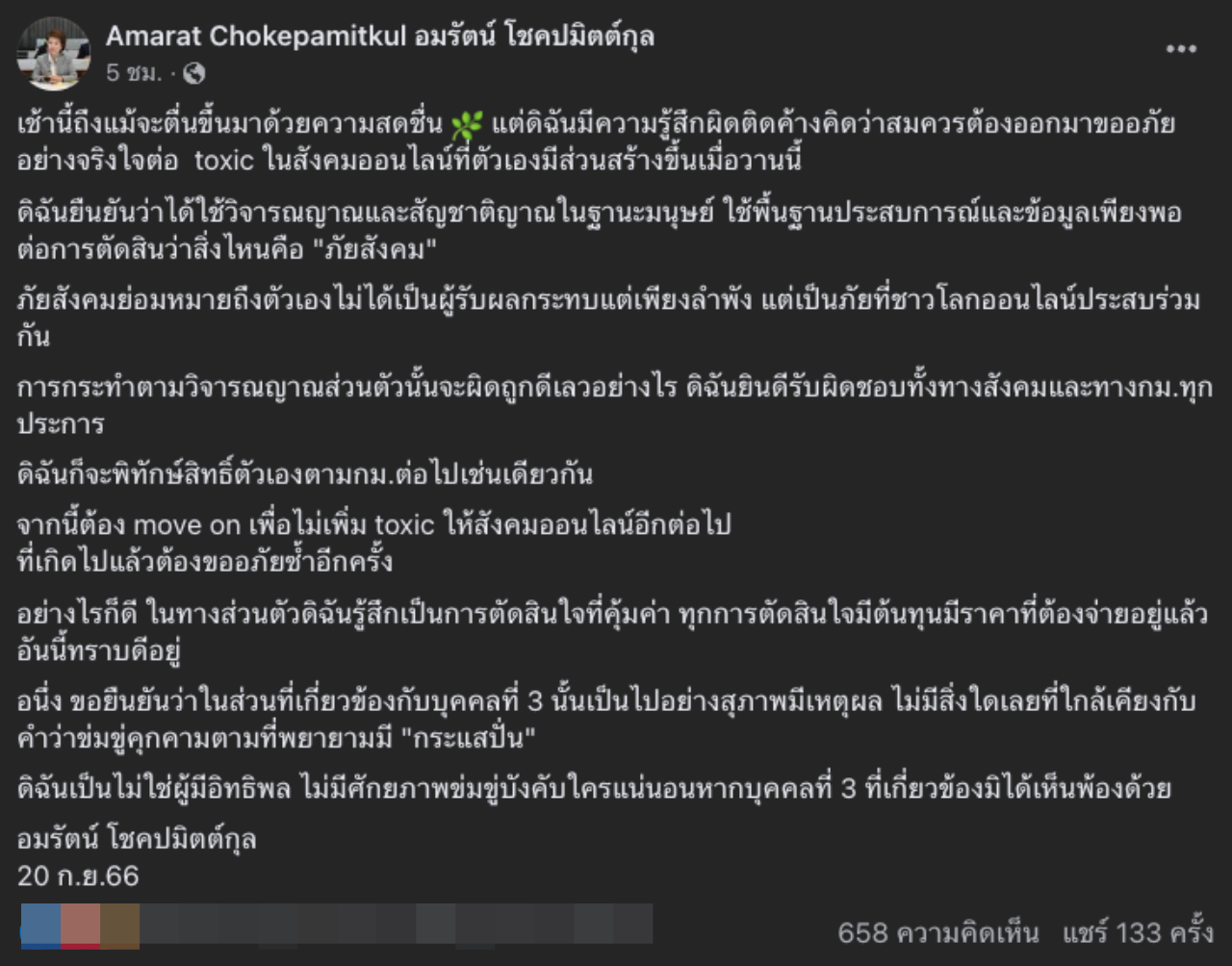 ทั้งยังบอกด้วยว่า ตื่นเช้ามาก็มีเพื่อนแคปโพสต์ส่งมาให้ว่า นางอมรัตน์ โพสต์ชี้เป้ามาที่ตน ยังตกใจว่าทำไมทำแบบนี้ แต่เราก็ไม่ได้ทำอะไร ไปทำงานปกติ กระทั่งก่อนเที่ยง มีคนแคปมาให้ดูว่า เขาตัดข้อมูลบางส่วนออก จากนั้นก็ทัวร์มาลงหนักมาก ซึ่งหากเป็นแบบนี้ เขาก็ควรไปใช้กระบวนการทางกฎหมายจัดการ
