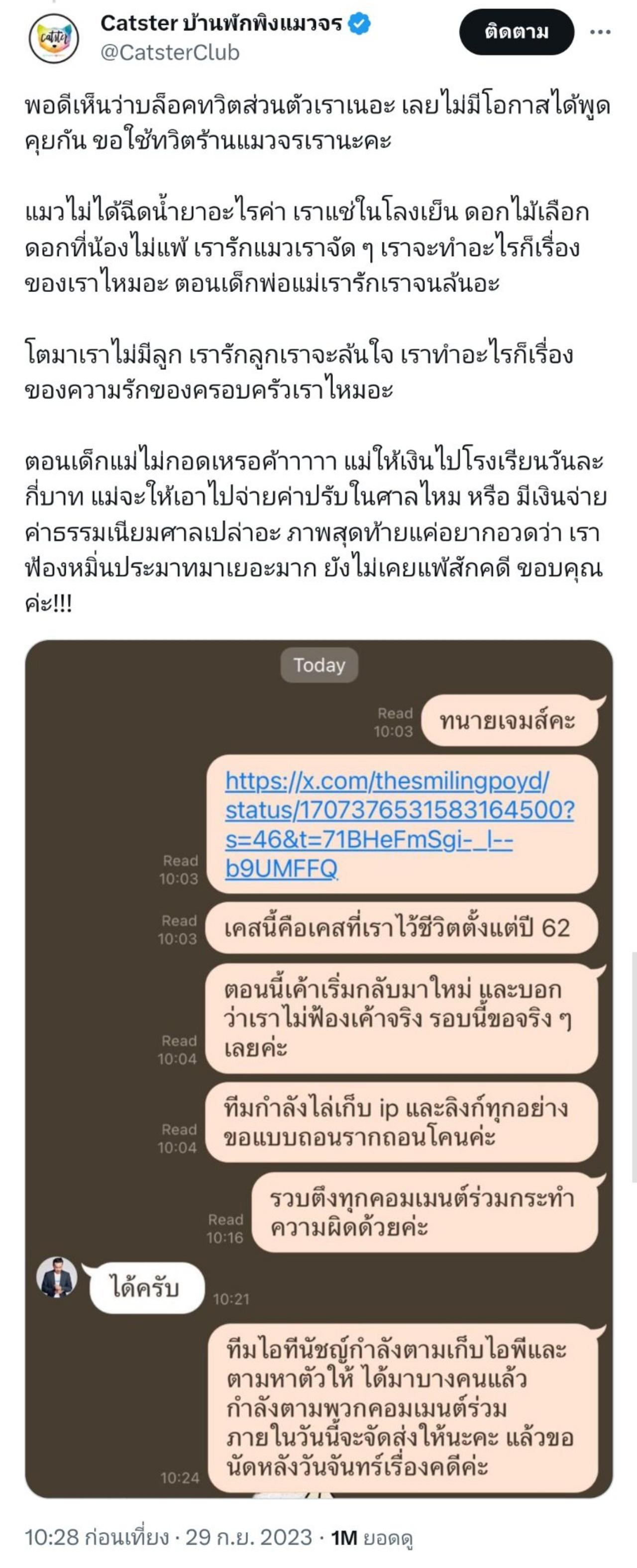 ก่อนที่คุณนัชญ์ จะใช้ทวิตเตอร์ (x) บัญชี "Catster บ้านพักพิงแมวจร" เข้าไปแสดงความคิดเห็น ระบุว่า "พอดีเห็นว่าบล็อคทวิตส่วนตัวเราเนอะ เลยไม่มีโอกาสได้พูดคุยกัน ขอใช้ทวิตร้านแมวจรเรานะคะ