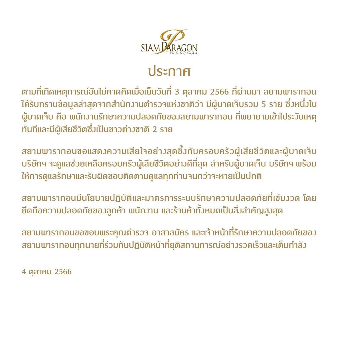 ล่าสุด สยามพารากอน ได้โพสต์ข้อความผ่านเฟซบุ๊ก Siam Paragon ระบุถึงเหตุการณ์ที่เกิดขึ้นว่า ตามที่เกิดเหตุการณ์อันไม่คาดคิดเมื่อเย็นวันที่ 3 ตุลาคม 2566 ที่ผ่านมา สยามพารากอนได้รับทราบข้อมูลล่าสุดจากสำนักงานตำรวจแห่งชาติว่า มีผู้บาดเจ็บรวม 5 ราย ซึ่งหนึ่งในผู้บาดเจ็บ คือ พนักงานรักษาความปลอดภัยของสยามพารากอน ที่พยายามเข้าไประงับเหตุทันที และมีผู้เสียชีวิตซึ่งเป็นชาวต่างชาติ 2 ราย