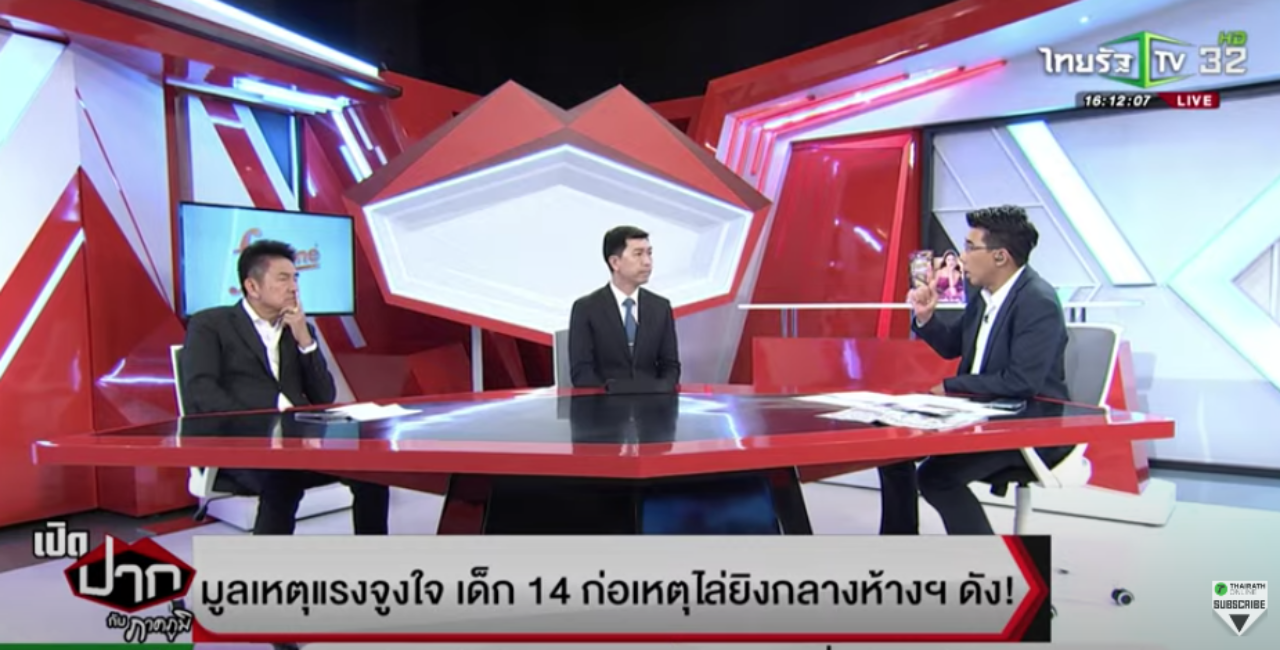 เมื่อเวลา 15.30 น. วันที่ 4 ตุลาคม 2566 ในรายการ "เปิดปากกับภาคภูมิ" ทางไทยรัฐทีวี ช่อง 32 ดำเนินรายการโดย นายภาคภูมิ พันธุ์สถิตย์ ได้พูดคุยกับแขกรับเชิญ รศ.พ.ต.ท.ดร.กฤษณพงค์ พูตระกูล ผู้ช่วยอธิการบดีและประธานกรรมการ คณะอาชญาวิทยาและการบริหารงานยุติธรรม ม.รังสิต และ พล.ต.ต.วิชัย สังข์ประไพ อดีตรองผู้บัญชาการตำรวจนครบาล ประเด็นเด็ก 14 ก่อเหตุยิงกลางพารากอน หลังตำรวจแจ้ง 5 ข้อหา ในความผิดฐาน "ฆ่าผู้อื่นโดยไตร่ตรองไว้ก่อน, พยายามฆ่า, มีอาวุธปืนไว้ในความครอบครองโดยไม่ได้รับอนุญาต, พกพาอาวุธปืนไปในเมือง หมู่บ้าน ทางสาธารณะโดยไม่ได้รับอนุญาต และยิงปืนในที่สาธารณะโดยไม่ได้รับอนุญาต"